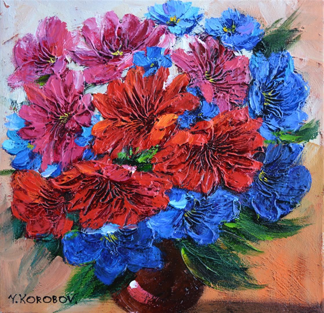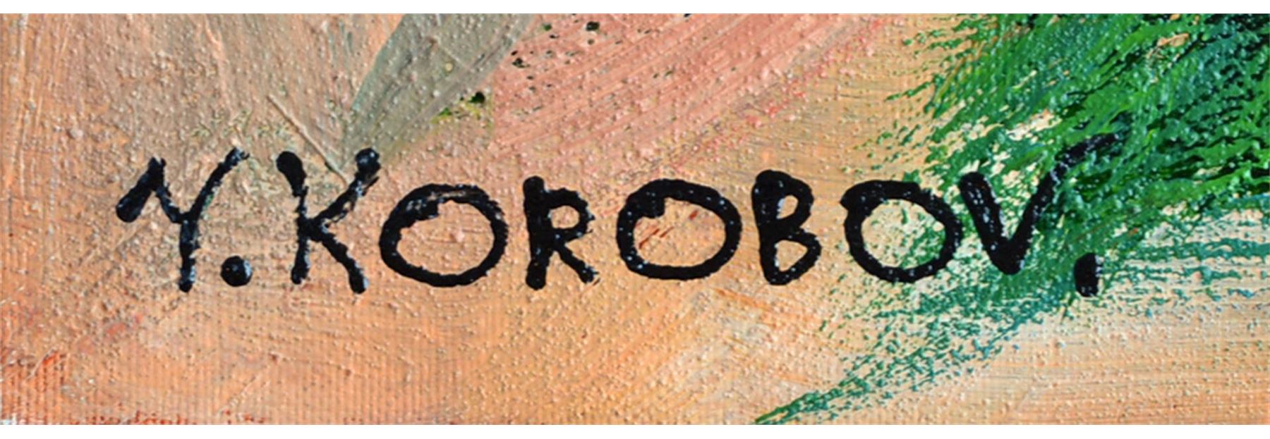 Artist: Yana Korobov (b. 1972) - Title: Love You More - Medium: Original Acrylic on Canvas - Signature: This one-of-a-kind work is hand-signed by the artist at the bottom of the image - Image Size: Approximately 20 inches x 20 inches - Framed: Stretched and Ready for Framing - Details: This work comes with a Certificate of Authenticity - Biography: Yana Korobov was born in the Ukraine in 1972. She studied at her local High School of the Arts in Kharkiv. She then went on to study at the Art & Industry College and the Sloboda State University in Kharkiv. She graduated as an art teacher from the State Art College in Kharkiv. In 2003 she immigrated to Israel. She is a young and upcoming artist whose work has been admired worldwide. Her artwork has recently been exhibited in Israel, the United Stated and Europe. -