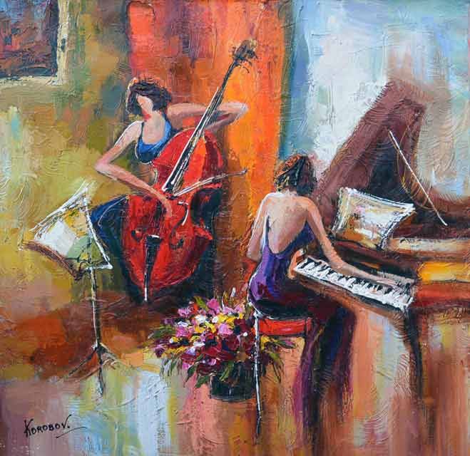 KOROBOV ** THE PLAYERS ** ACRYLIC. Artist: Yana Korobov (b. 1972) - Title: The Players - Medium: Original Acrylic on Canvas - Signature: This one-of-a-kind work is hand-signed by the artist at the bottom of the image - Image Size: Approximately 29 inches x 29.75 inches - Framed: Unframed on Unstretched Canvas - Biography: Yana Korobov was born in the Ukraine in 1972. She studied at her local High School of the Arts in Kharkiv. She then went on to study at the Art & Industry College and the Sloboda State University in Kharkiv. - She graduated as an art teacher from the State Art College in Kharkiv. In 2003 she immigrated to Israel. She is a young and upcoming artist whose work has been admired worldwide. Her artwork has recently been exhibited in Israel, the United Stated and Europe. - Warranty: Item GUARANTEED to be as described