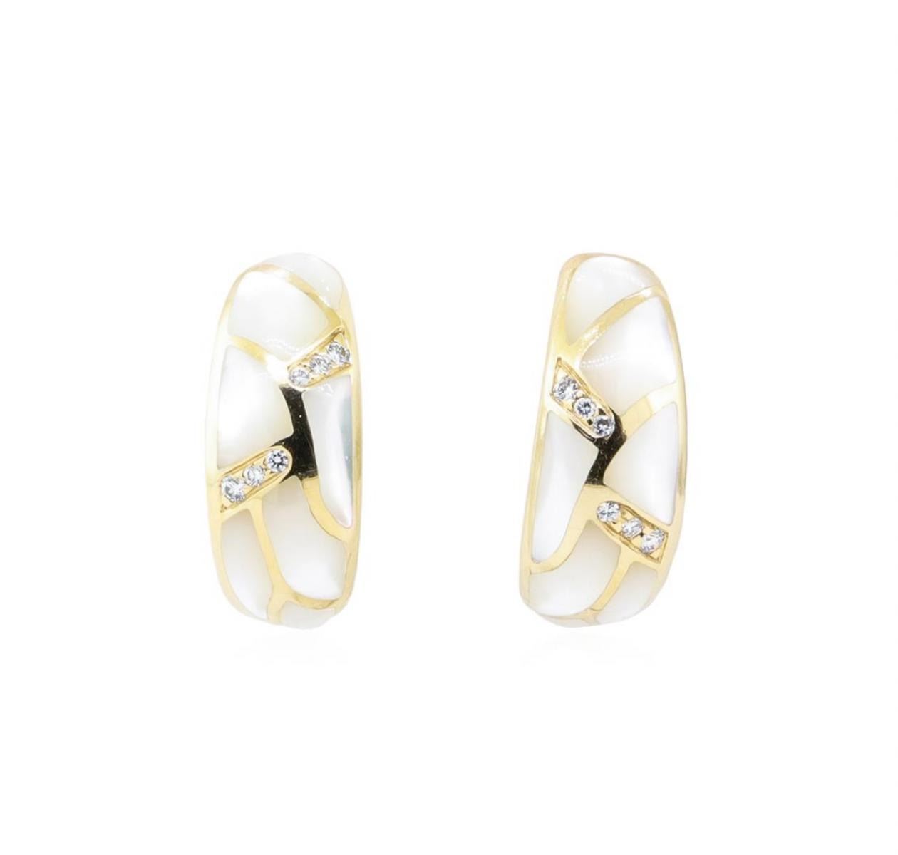 One pair of Kabana earrings featuring: 14KT yellow gold weighing 9.4 grams containing diamonds weighing 0.25ctw and inlaid mother of pearl.