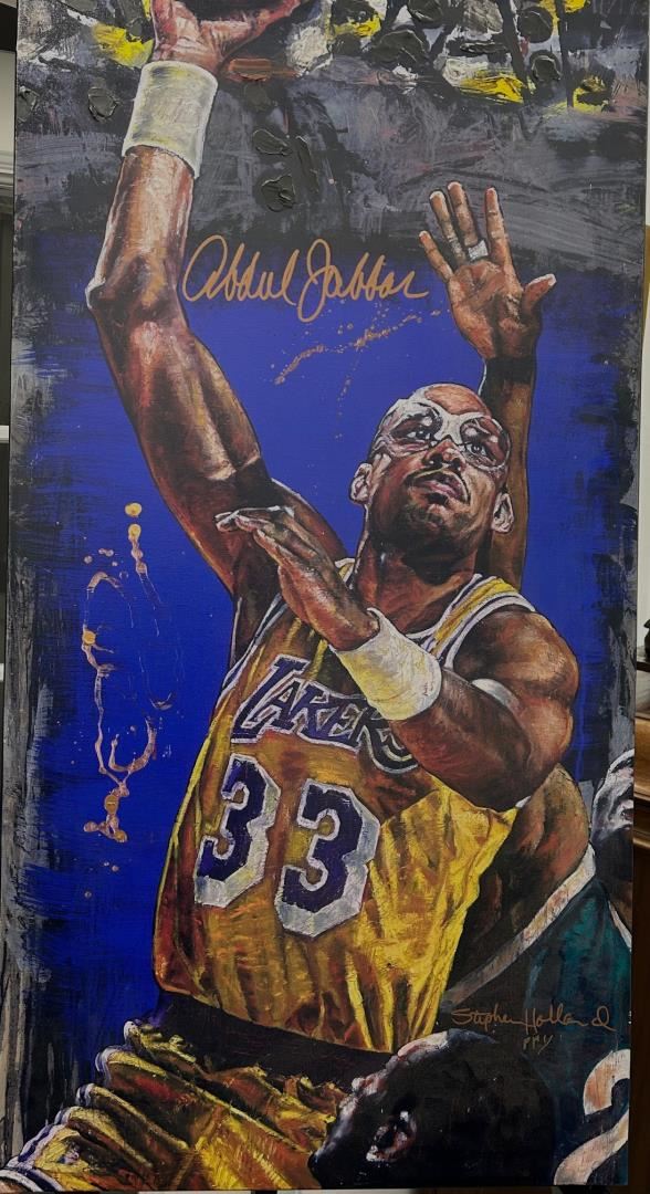Stephen Holland captures the great Kareem Abdul-Jabbar. Hand-signed by Kareem & artist 42" x 21.75" Giclee PP1, stretched, hand-embellished, slight mildew on back. Does not show thru