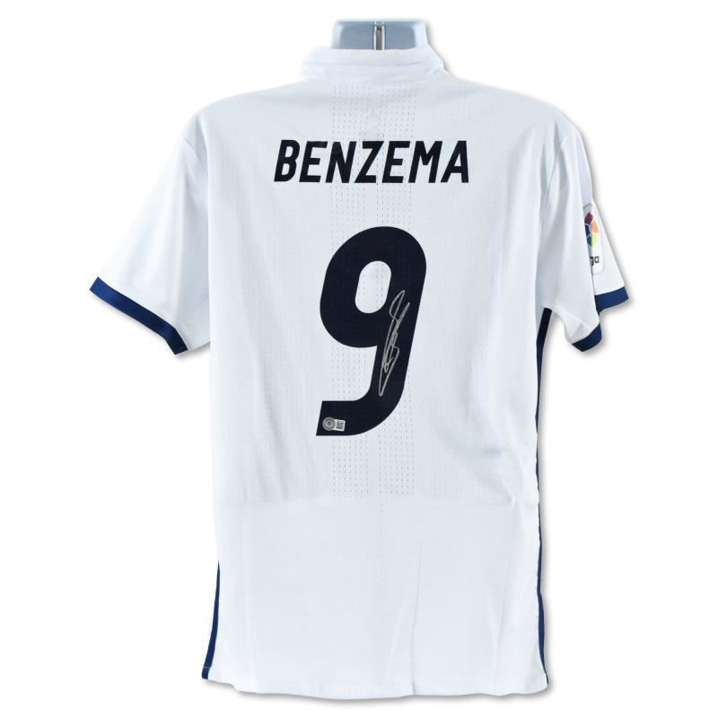 This is a replica Real Madrid 16/17 soccer Jersey autographed by Karim Benzema. This piece is presented with a Certificate of Authenticity from Beckett with a QR code and certification number. Measures approx. 30" x 28" (jersey).