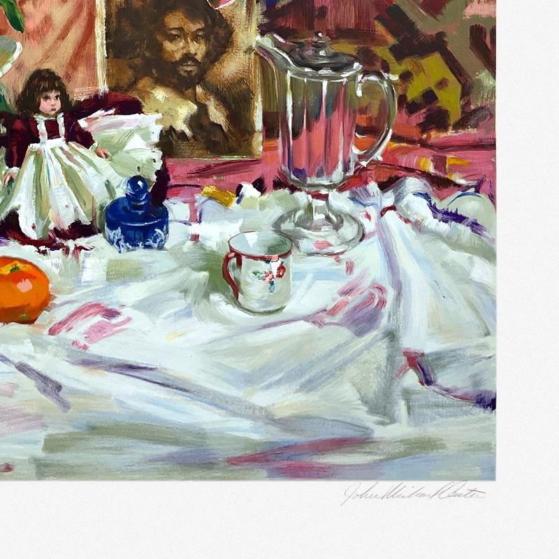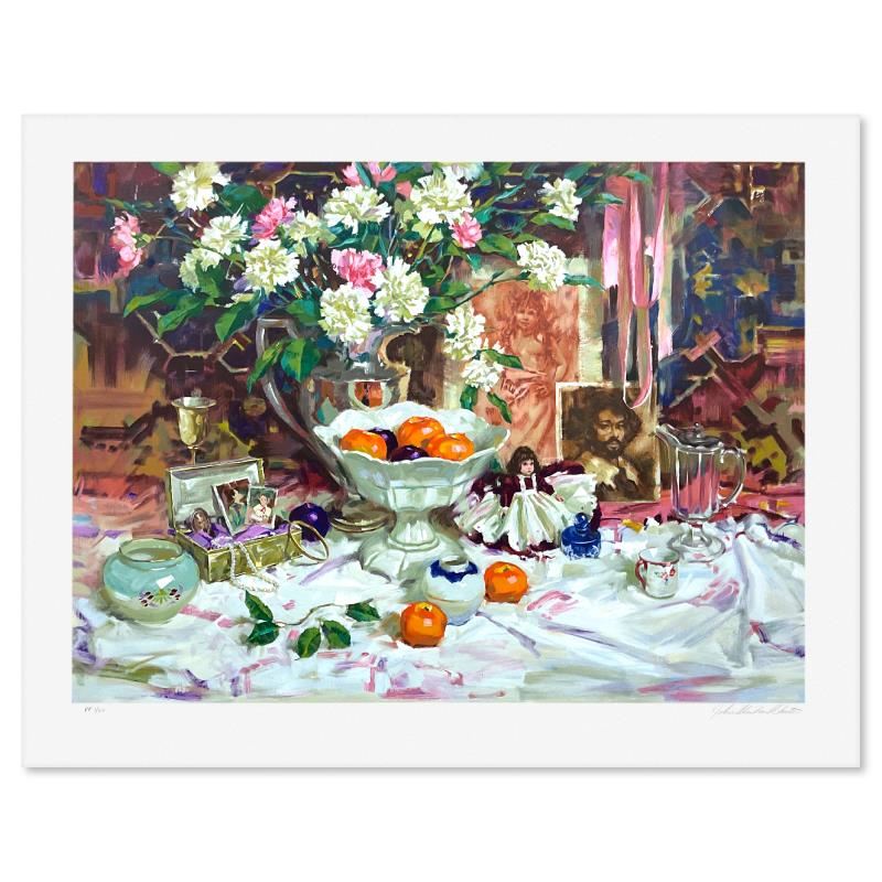 "Keepsakes" is a limited edition printer's proof serigraph on paper by John Michael Carter, numbered 1/20 and hand signed by the artist. Includes Letter of Authenticity. Measures approx. 30.5" x 38.5" (border), 25" x 33.5" (image). There is a very small faint grey spot on the top-right edge of the white border.