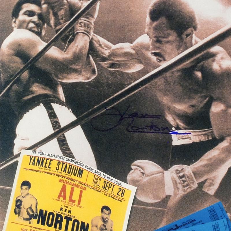 A must-have photo collage commemorating the monumental boxing matches between Mohammad Ali and Ken Norton, "Ken Norton and Ali Ticket" is hand-autographed by Norton (1943-2013)! Includes Certificate of Authenticity! Measures approx. 12" x 14" (no border).