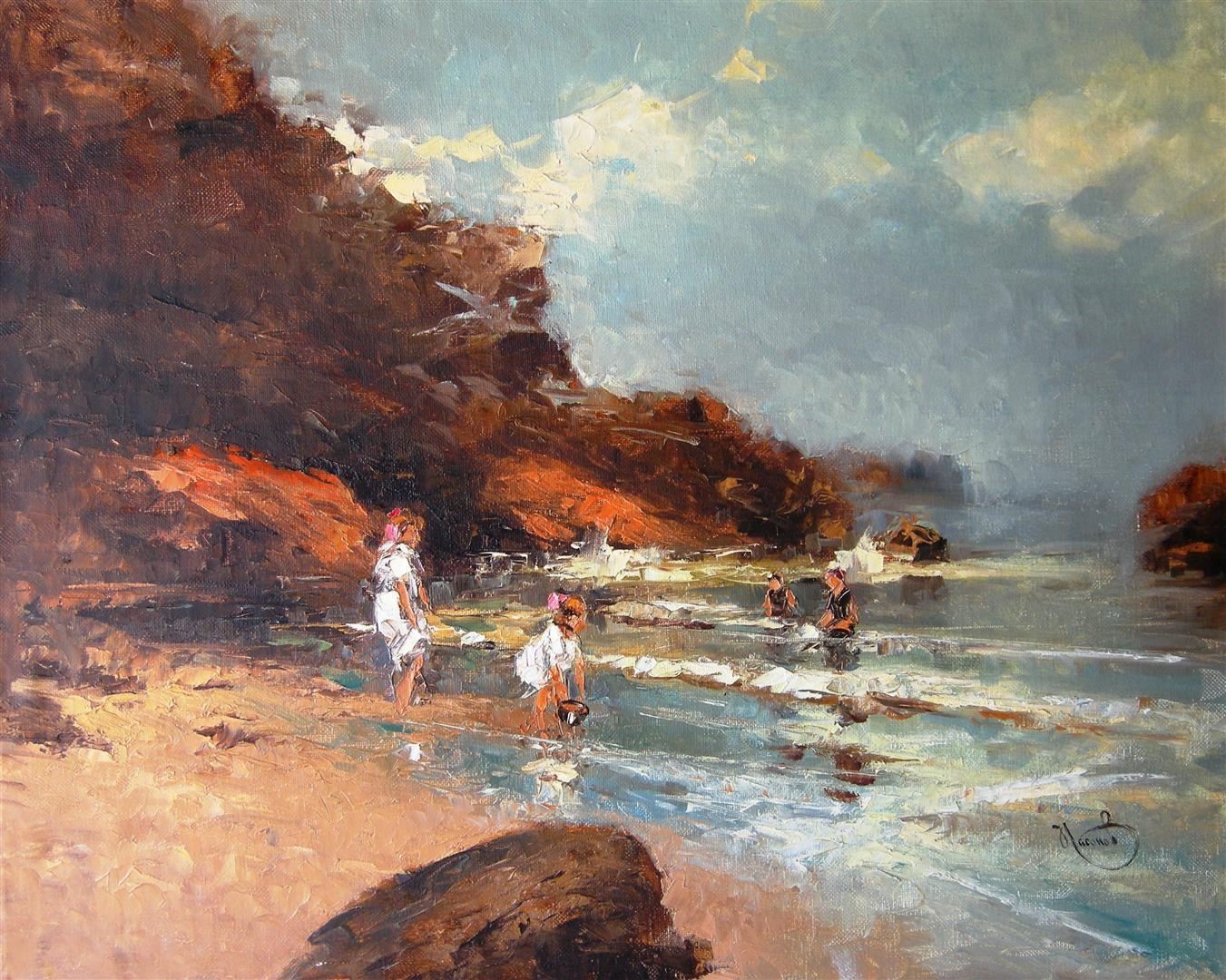 Children playing in the shallow waters of a beach display the influence of French Impressionism in Russian artist Vladimir Nasonov's oil on canvas. The painting measures 24 x 30; framed image measures approx. 36 x 42.