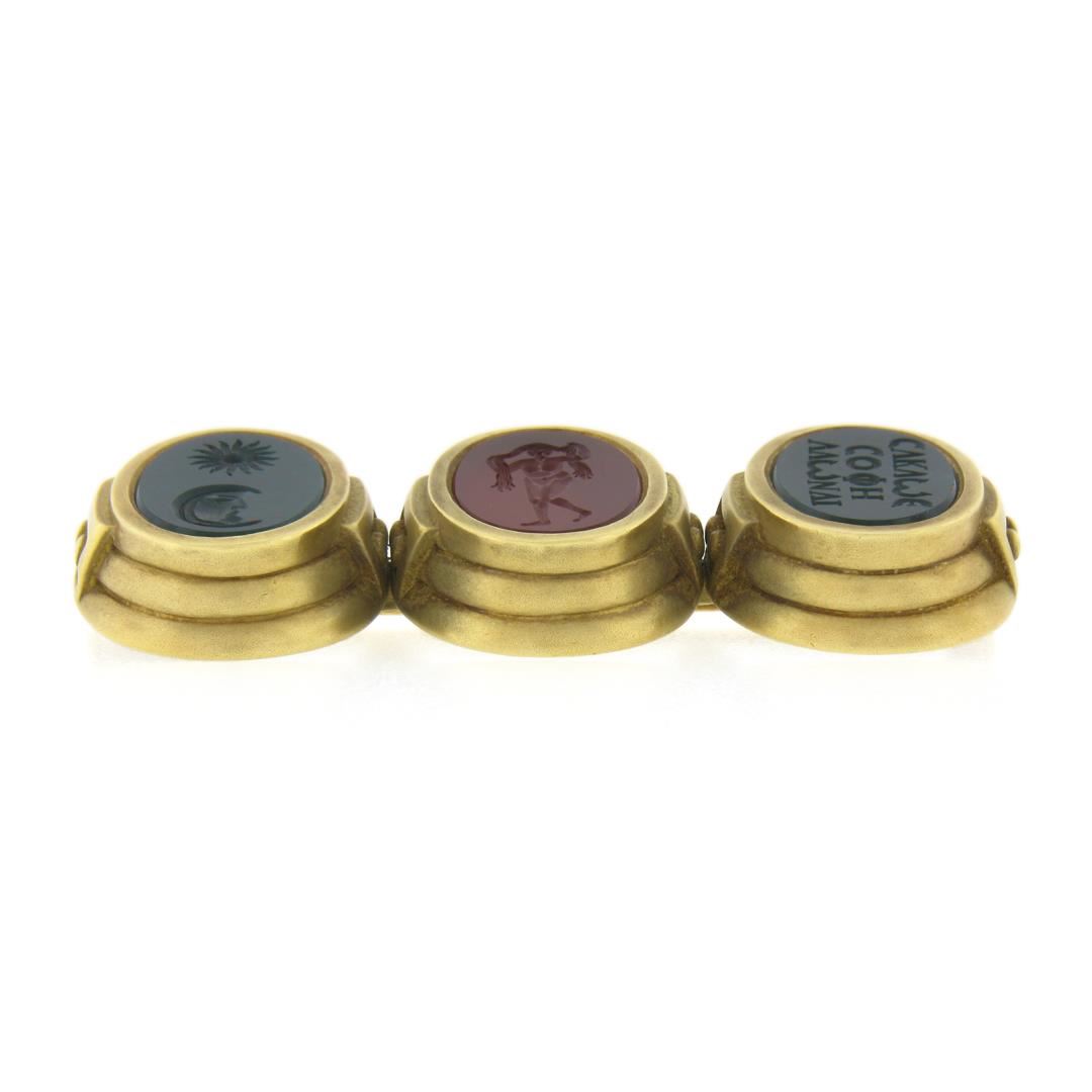 A solid 18k green gold bar brooch by Kieselstein Cord, with 2 green bloodstones & 1 orange carnelian. Measures 21.2x56.3mm and weighs a total of 32.57 grams.