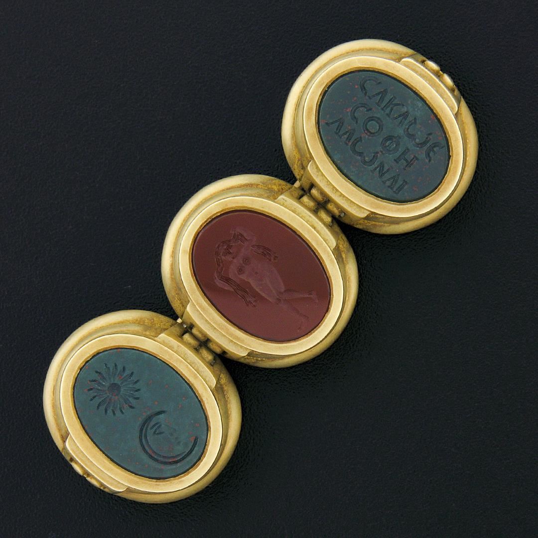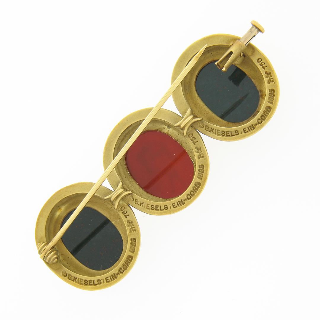 A solid 18k green gold bar brooch by Kieselstein Cord, with 2 green bloodstones & 1 orange carnelian. Measures 21.2x56.3mm and weighs a total of 32.57 grams.