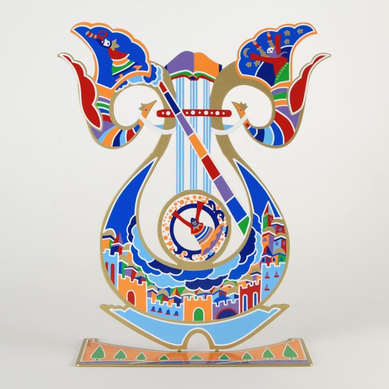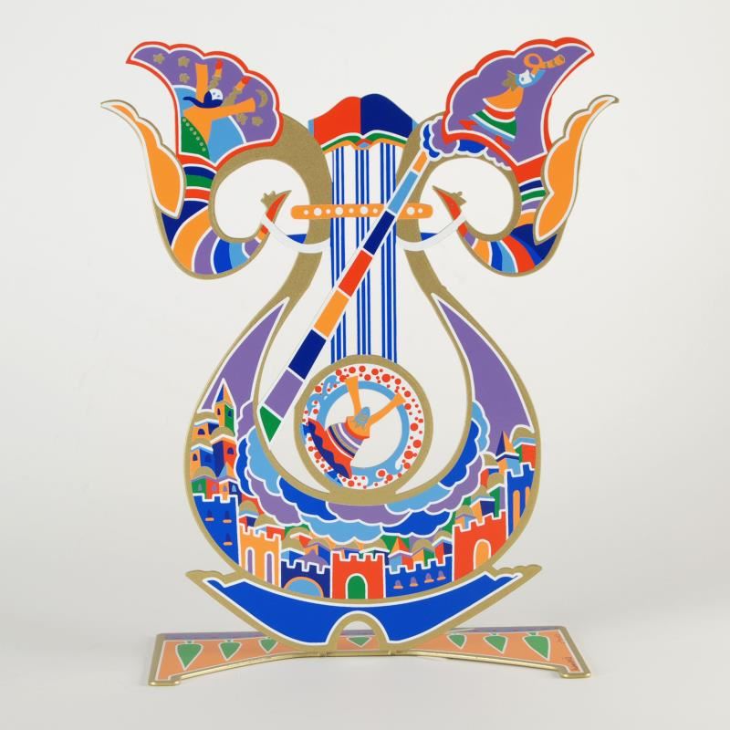 "King David's Harp" is a limited edition metal sculpture by Raphael Abecassis, numbered and hand signed by the artist. This piece features a different design on each side and is numbered in Hebrew on the sculpture's base. Includes Certificate of Authenticity. Measures approx. 11.5" (width) x 13.5" (height); 4.5" (depth of base).