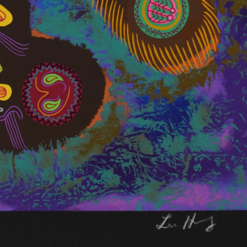 "Kitty Camp Playmates (Black)" is a limited edition serigraph on paper by Lu Hong, numbered and hand signed by the artist. Includes Letter of Authenticity. Measures approx. 24" x 24.5" (with border), 20" x 20" (image).