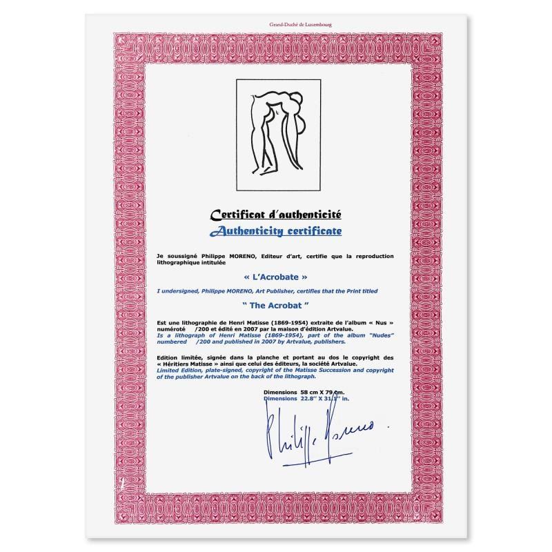 "L'Acrobate" is a limited edition lithograph by Henri Matisse (1869-1954) bearing the plate signature of the artist. This piece comes from an edition of 200 authorized by the Matisse Estate; the edition number is not on the piece itself but on the certificate. This piece comes custom framed. Includes Certificate of Authenticity. Measures approx. 28.5" x 37" (frame), 22.5" x 31" (image).