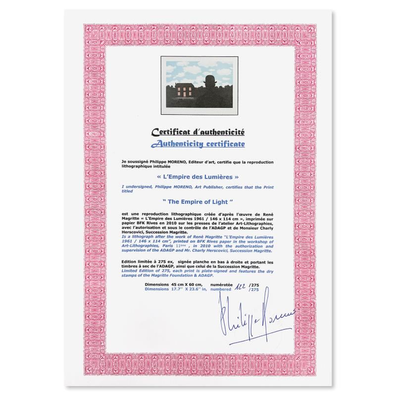 "L'Empire des Lumieres (The Empire of Light)" is a limited edition lithograph by Rene Magritte (1898-1967). This piece is numbered 122/275 and bears the dry stamps of the Magritte Foundation & ADAGP (Society of Authors in the Graphic and Plastic Arts) and is signed by the President of the Magritte Foundation, Charly Herscovici. This piece comes custom framed. Includes Certificate of Authenticity. Measures approx. 29.5" x 24" (frame), 23.5" x 18" (image).
