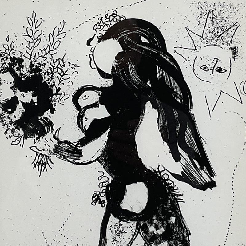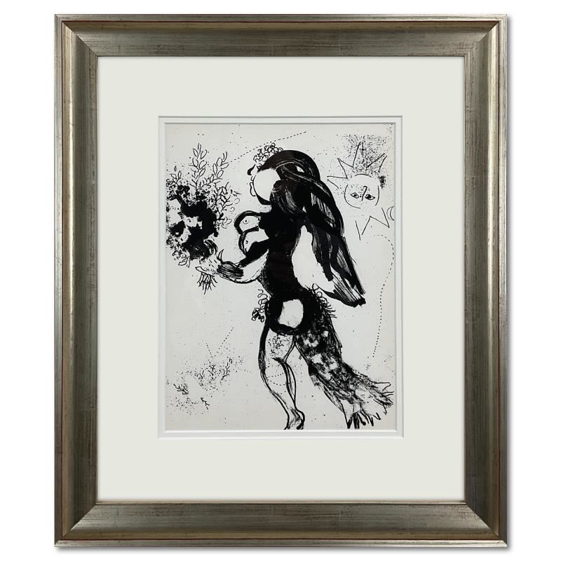 "L'offerande" is a lithograph on paper by Marc Chagall (1887-1985). This piece comes custom framed. Includes Letter of Authenticity. Measures approx. 17.5" x 20.5" (frame), 9" x 12.5" (image).