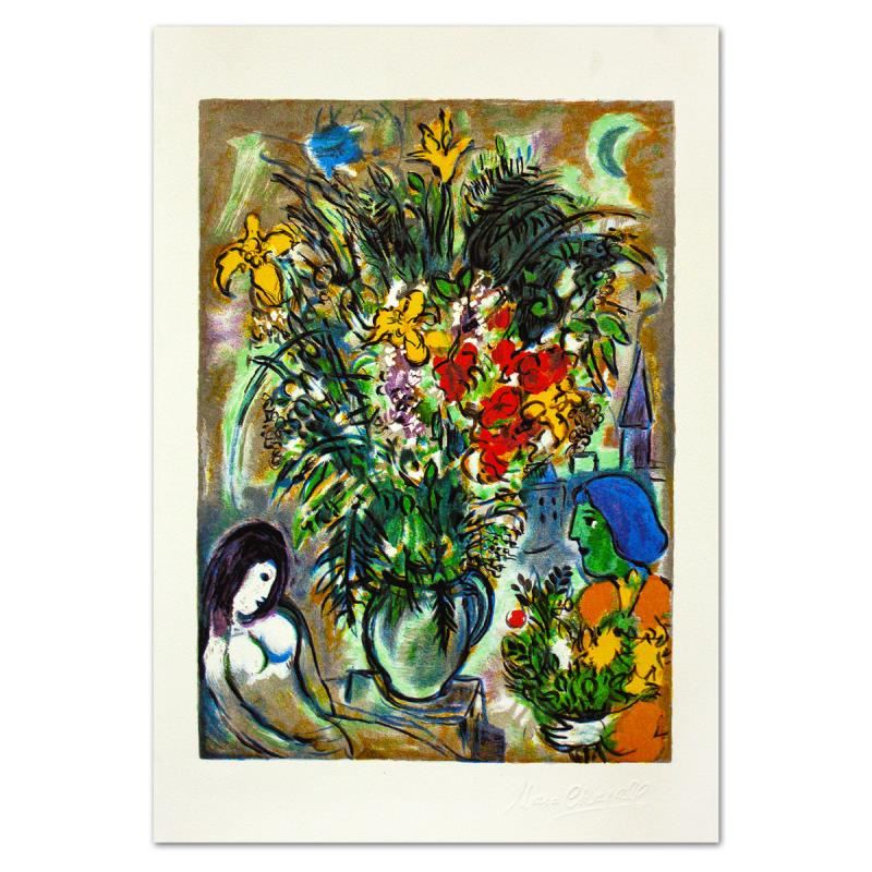 "L'offrande" is a limited edition serigraph on paper by Marc Chagall (1887-1985). Printed by Atelier Tete a Tete in Paris and authorized by the Chagall Estate and ADAGP Paris , the piece is plate signed and comes with a certificate of authenticity. Measures approximately 19.5" x 13.5".