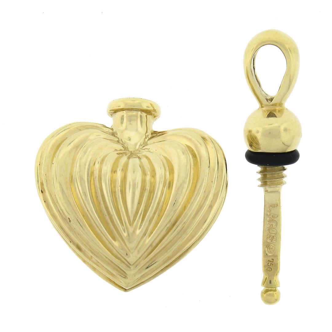 A solid 18k yellow gold bottle pendant by Lagos. The pendant weighs a total of 18.69 grams, measures 35.4x21.3mm including the bail, and the inside of the bail measures 5.8x3.6mm.