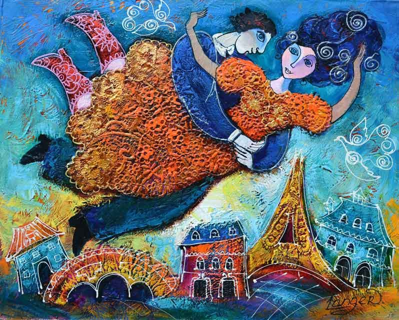 Artist: Yulia Langer - Title: Love Songs - Medium: Original Acrylic on Canvas - Signature: This one-of-a-kind work is hand-signed by the artist at the bottom of the image - Image Size: Approximately 20 inches x 24 inches - Unframed on Unstretched Canvas - Details: This work comes with a Certificate of Authenticity - Biography: Yulia Langer was born in Kharkiv, Ukraine in 1972. After studying Art in Skovoroda, Kharkiv National University, Yulia continued teaching Fine Arts for a number of years. In 2003 Yulia moved to Israel, settling near Tel Aviv, and began focusing on her passion - painting. - Yulia Langer's canvases are a fusion of story, form and color. Romance and intimacy are reoccurring themes in her paintings, while in the background the viewer will find motifs of surrealism and naivety along with a certain musical subtext. Texture plays an important role in Langer's art. Various techniques, such as collage, music scores, lace and crochet, relief work, metallic paints and golden leaves, along with an uninhibited use of strong colors, are part of Yulia creations. In her paintings one can feel the presence of Marc Chagall, one of the great masters of the 20th century, and of the late Theo Tobiasse. - Today, you can find Langer's paintings in top galleries, and distinguished, private collections throughout the world. -