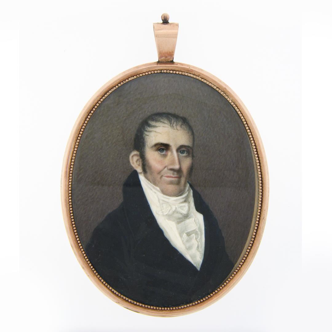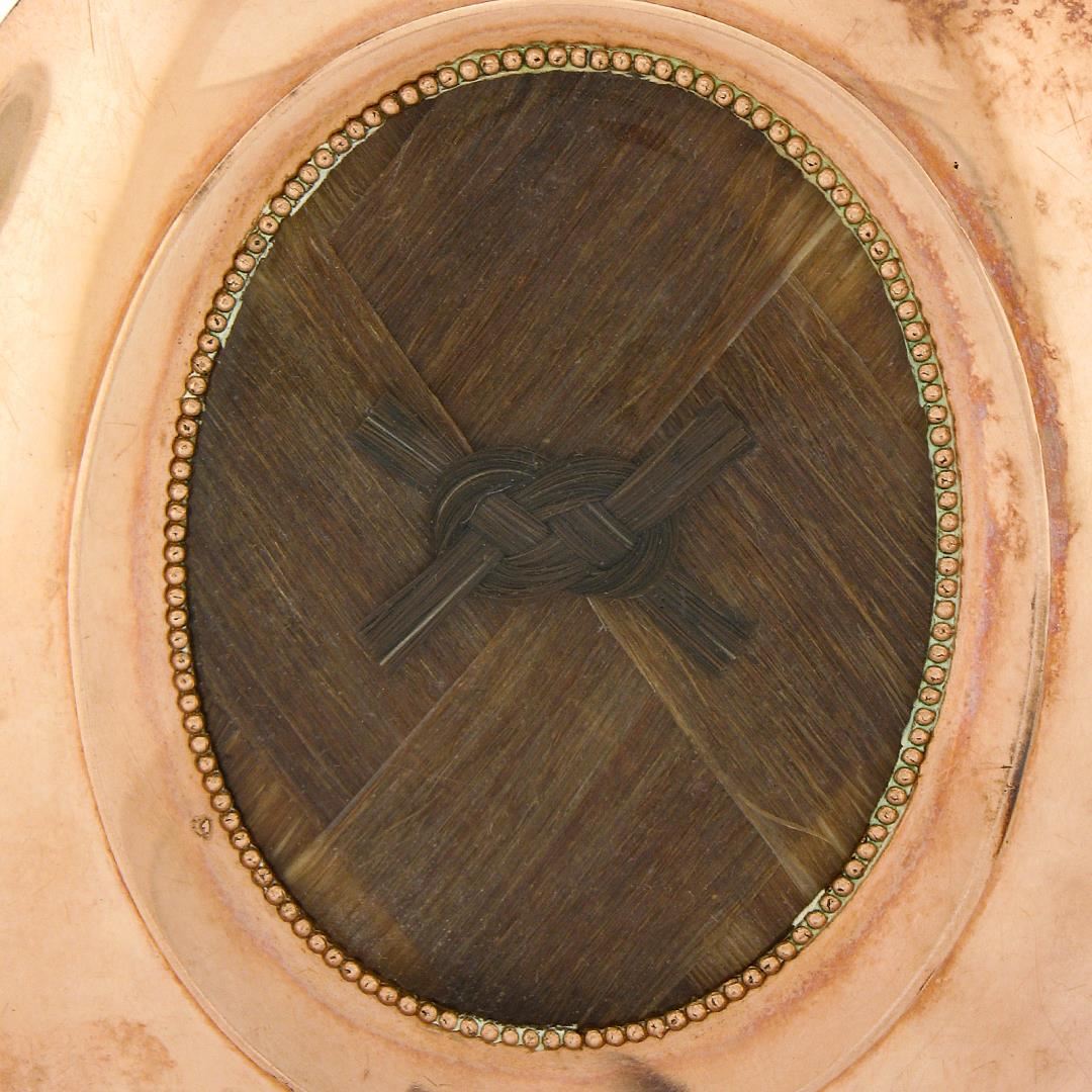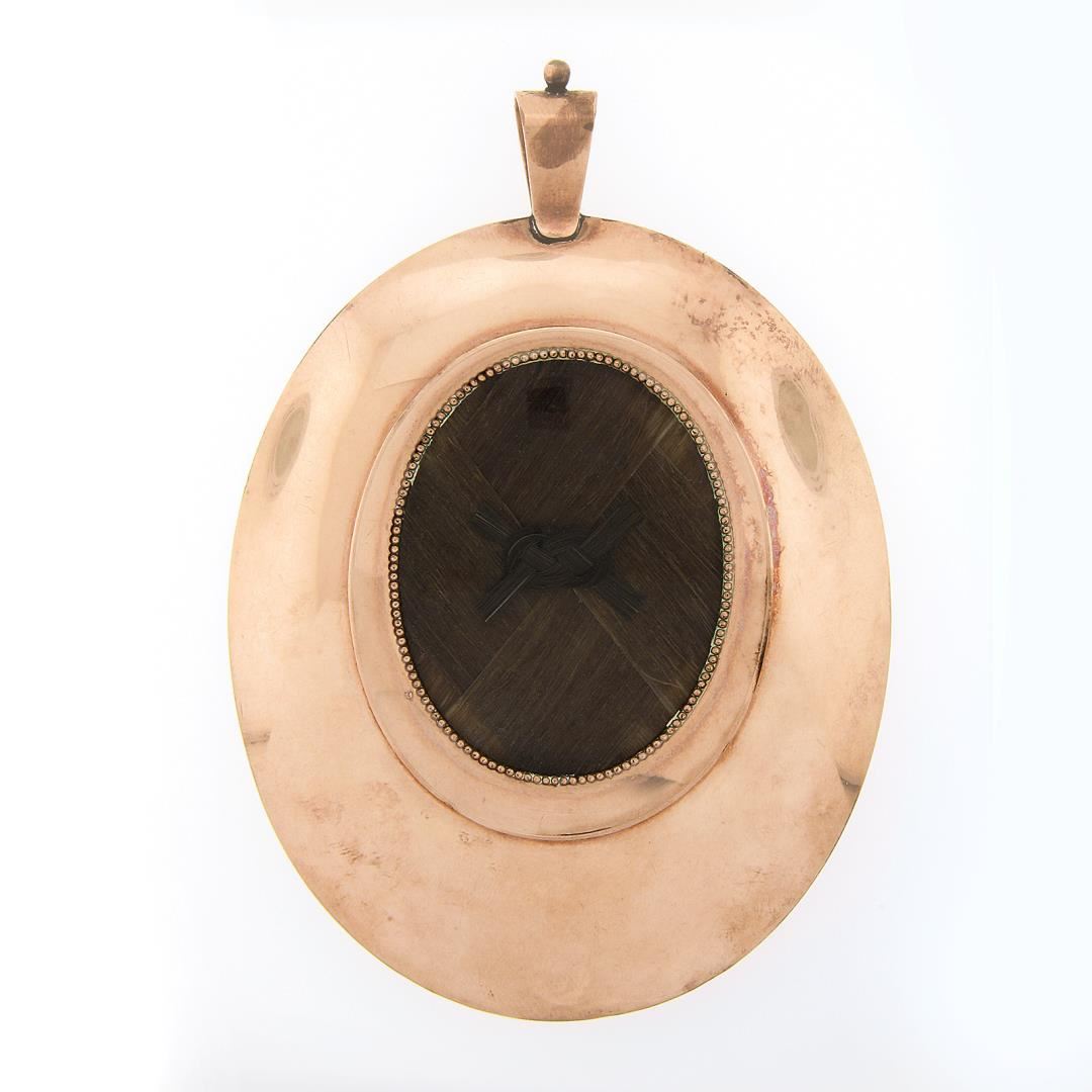 An antique solid 12+k yellow gold mourning pendant, with paint & hair. The pendant weighs a total of 46.50 grams, measures 91.70mx62.90mm including the bail, and the inside of the bail measures ##x##mm.