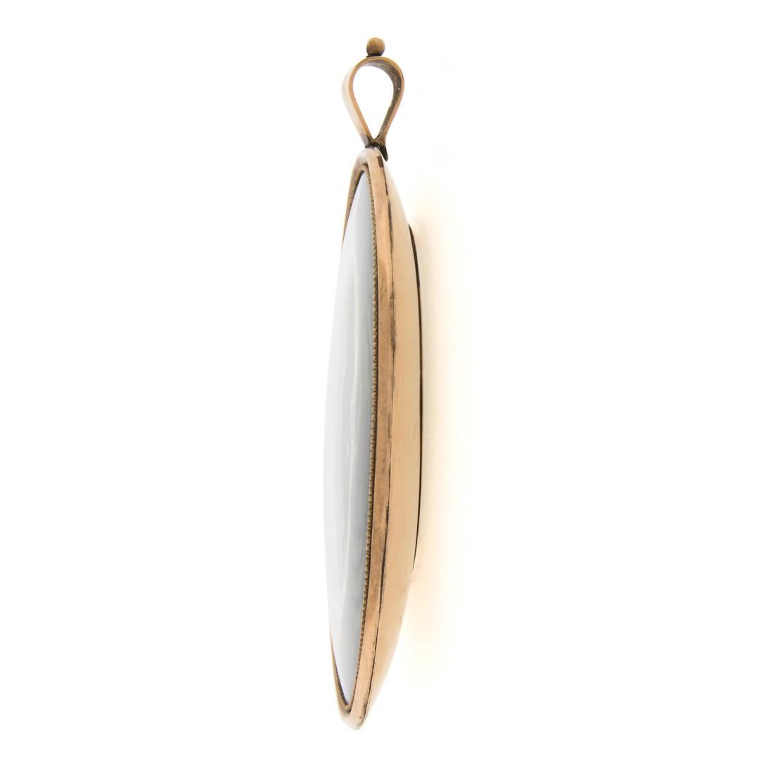 An antique solid 12+k yellow gold mourning pendant, with paint & hair. The pendant weighs a total of 46.50 grams, measures 91.70mx62.90mm including the bail, and the inside of the bail measures ##x##mm.