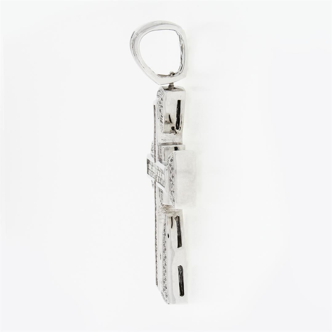 A solid 14k white gold large cross pendant, with 177 princess cut natural diamonds (SI1/SI2 ; I/J - 9.65ctw), & 146 round brilliant cut natural diamonds (SI2/I1 ; I/J - 1.10ctw). The pendant weighs a total of 75.98 grams, measures 95x57mm including the bail, and the inside of the bail measures 15.5x13.7mm.