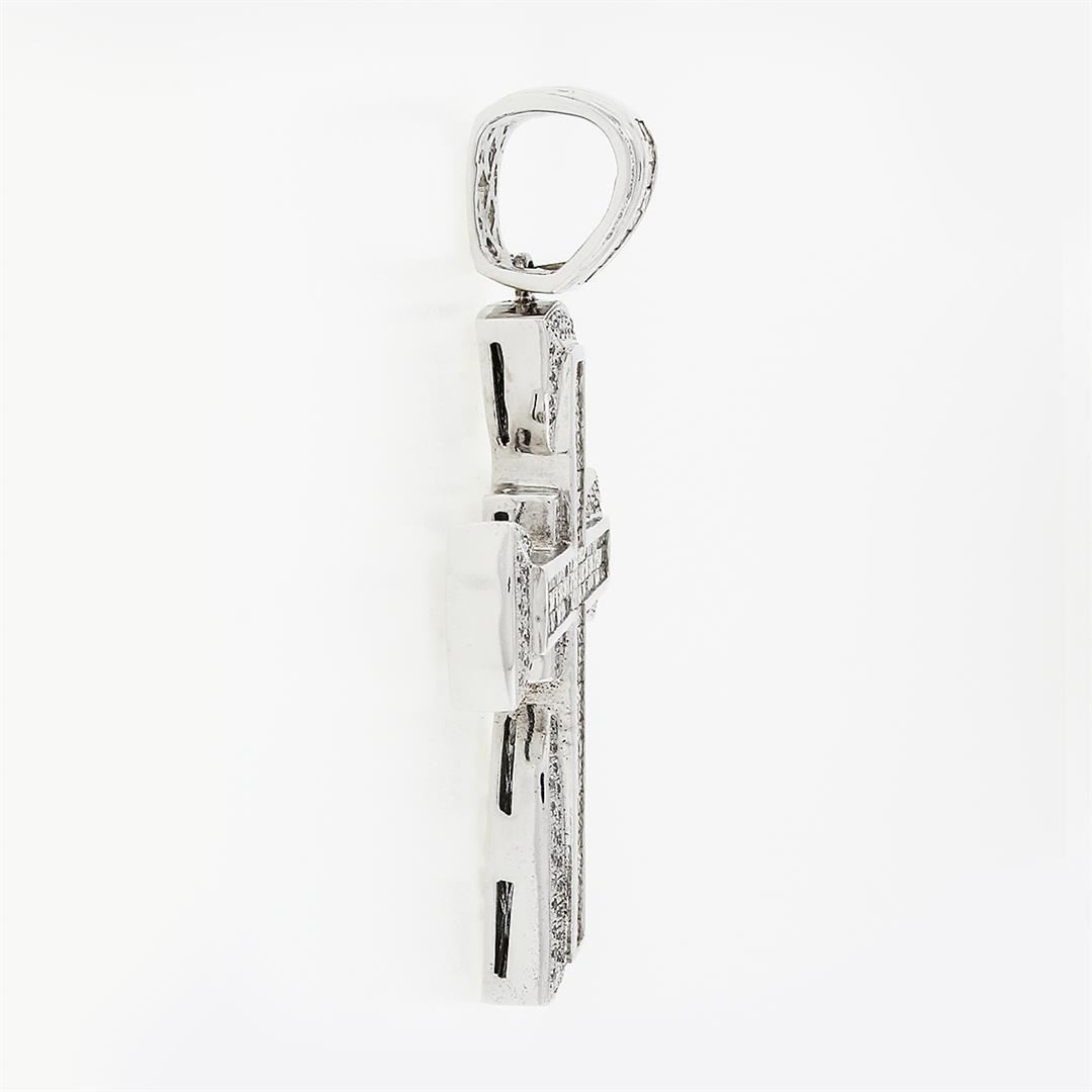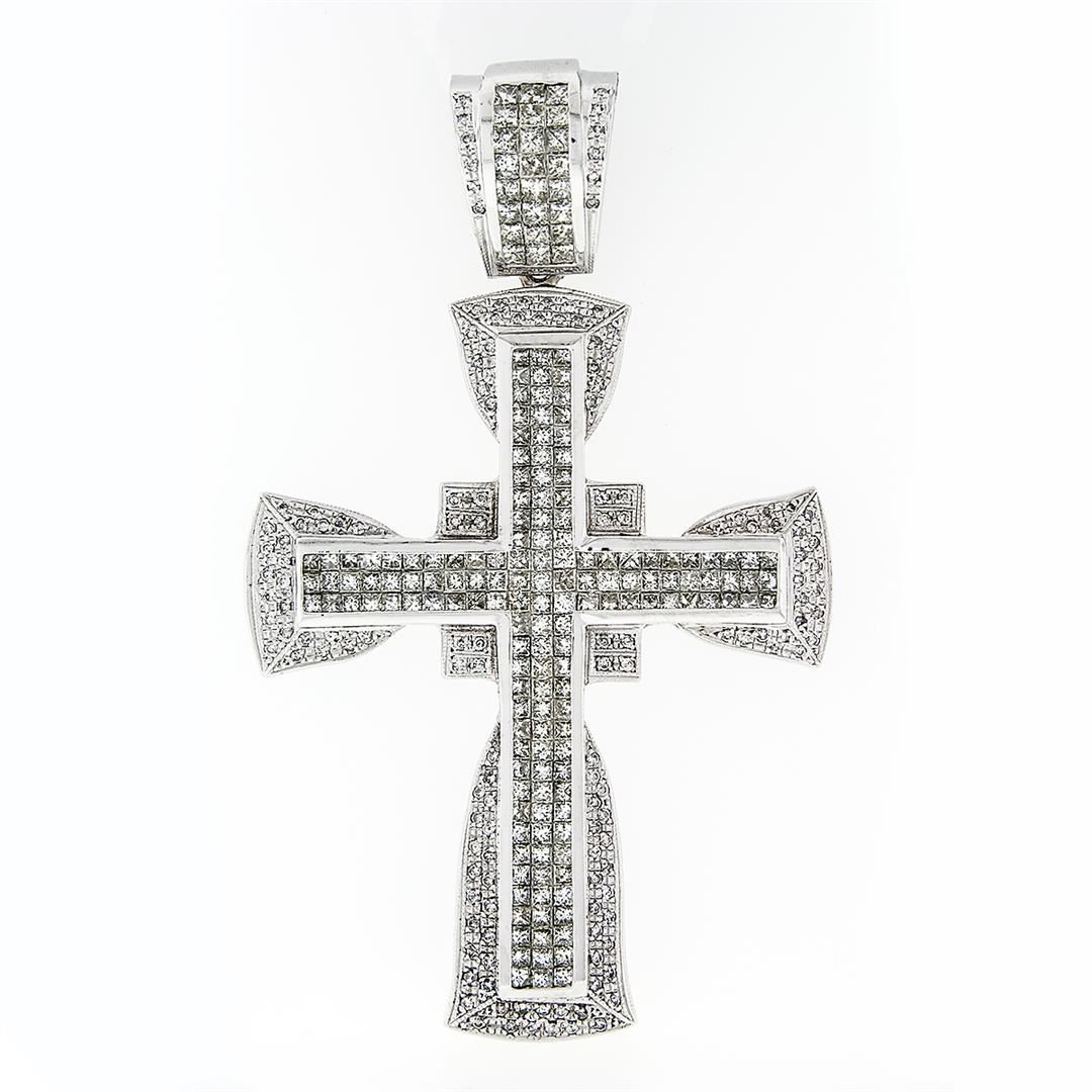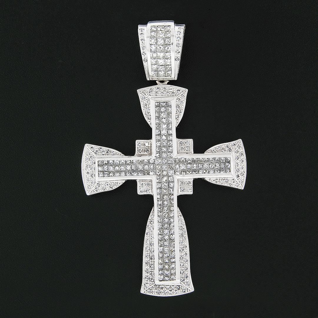 A solid 14k white gold large cross pendant, with 177 princess cut natural diamonds (SI1/SI2 ; I/J - 9.65ctw), & 146 round brilliant cut natural diamonds (SI2/I1 ; I/J - 1.10ctw). The pendant weighs a total of 75.98 grams, measures 95x57mm including the bail, and the inside of the bail measures 15.5x13.7mm.