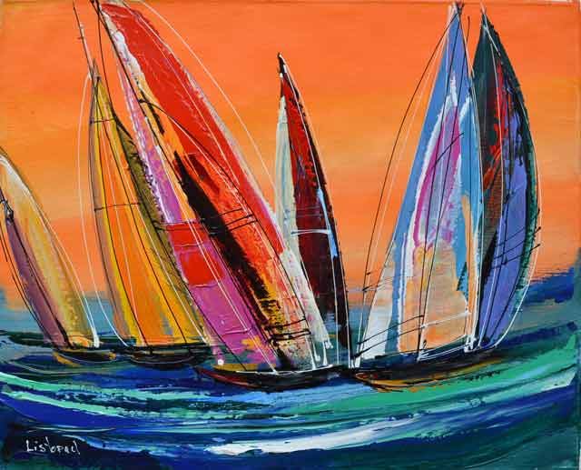 LISTOPAD **SUNDOWN SAILS ** ORIGINAL ACRYLIC. Artist: Natalya Listopad - Title: Sundown Sails - Medium: Original Acrylic on Canvas - Signature: This one-of-a-kind work is hand-signed by the artist at the bottom of the image - Image Size: Approximately 16 inches x 20 inches - Framed: Unframed and Unstretched - Details: This work comes with a Certificate of Authenticity - Biography: Natalya Listopad was born in a small village near Kharkov Ukraine in 1957. Having studied at the Academy of Art in Kharkov, Listopad later joined numerous show groups all over Ukraine. In 2001 she immigrated to Israel with her daughter and her husband, a talented artist in his own right. - Natalya's works are exhibited and collected throughout Ukraine, Israel and USA. - Warranty: Item GUARANTEED to be as described