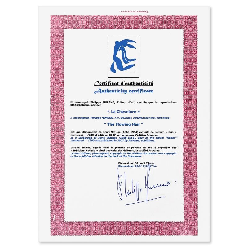"La Chevelure" is a limited edition lithograph by Henri Matisse (1869-1954) bearing the plate signature of the artist. This piece comes from an edition of 200 authorized by the Matisse Estate; the edition number is not on the piece itself but on the certificate. Includes Certificate of Authenticity. Measures approx. 22.5" x 31" (image).