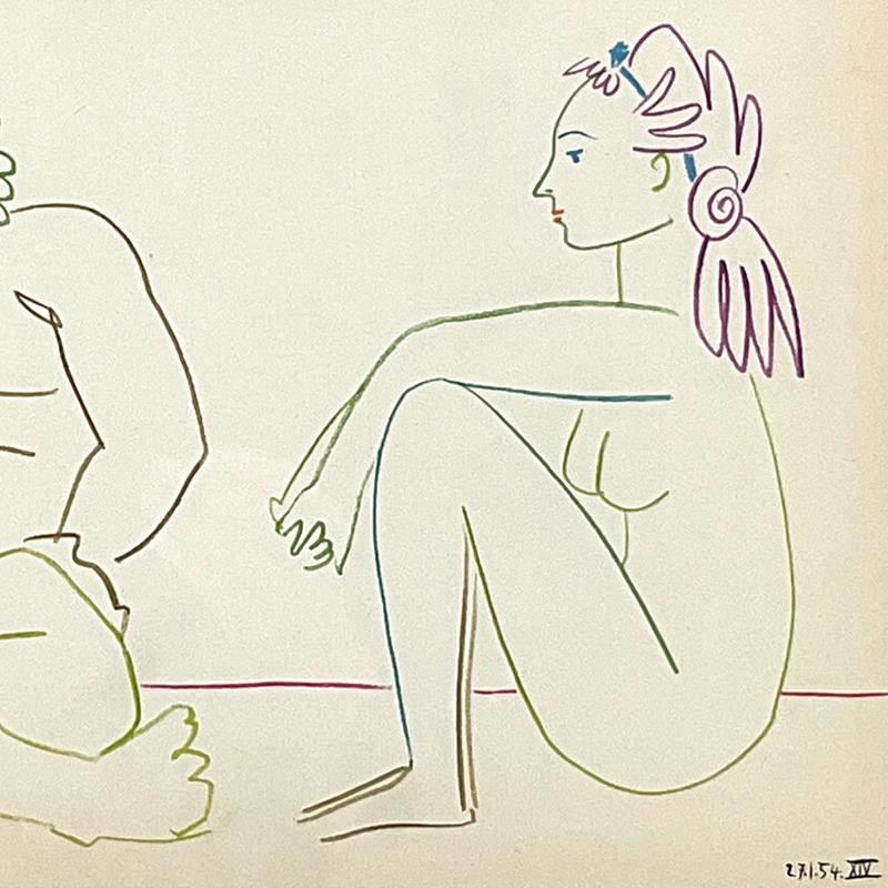 "La Comedie Humaine 27.1.54-I" is a vintage lithograph on paper by Pablo Picasso (1881-1973). This piece is from Picasso's Carnet de Californie Series and was printed in Paris, France by Mourlot Studios in 1959. This piece comes framed. Includes Letter of Authenticity. Measures approx. 18" x 21" (frame), 10" x 13" (image).