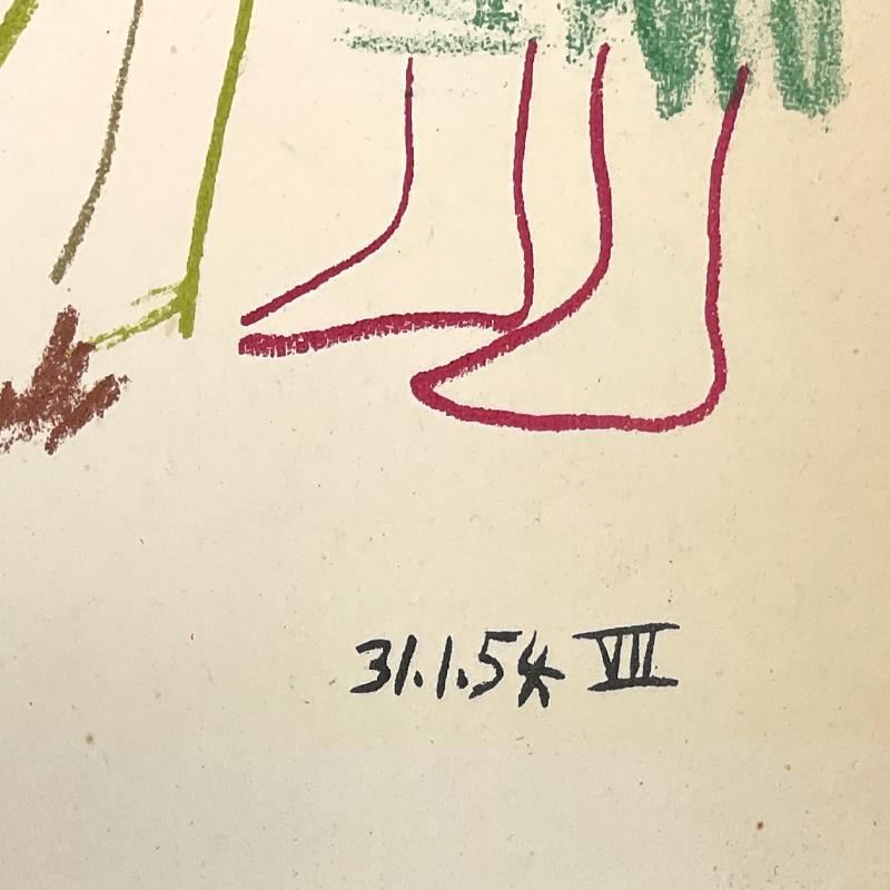 "La Comedie Humaine 31.1.54-VII" is a lithograph on paper by Pablo Picasso (1881-1973). This piece is from Picassos Human Comedy Series and was printed in Paris France by Mourlot Studios in 1954. This piece comes framed. Includes Letter of Authenticity. Measures approx. 18" x 21" (frame) 10" x 13" (image).