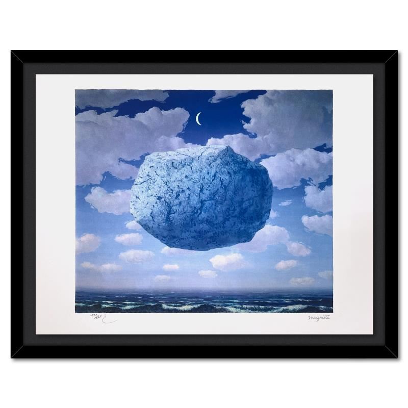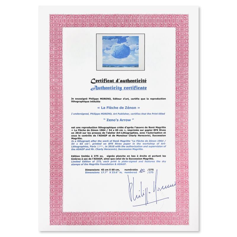 "La Fleche de Zenon (Zeno's Arrow)" is a limited edition lithograph by Rene Magritte (1898-1967). This piece is numbered 122/275 and bears the dry stamps of the Magritte Foundation & ADAGP (Society of Authors in the Graphic and Plastic Arts) and is signed by the President of the Magritte Foundation, Charly Herscovici. This piece comes custom framed. Includes Certificate of Authenticity. Measures approx. 29.5" x 24" (frame), 23.5" x 18" (image).