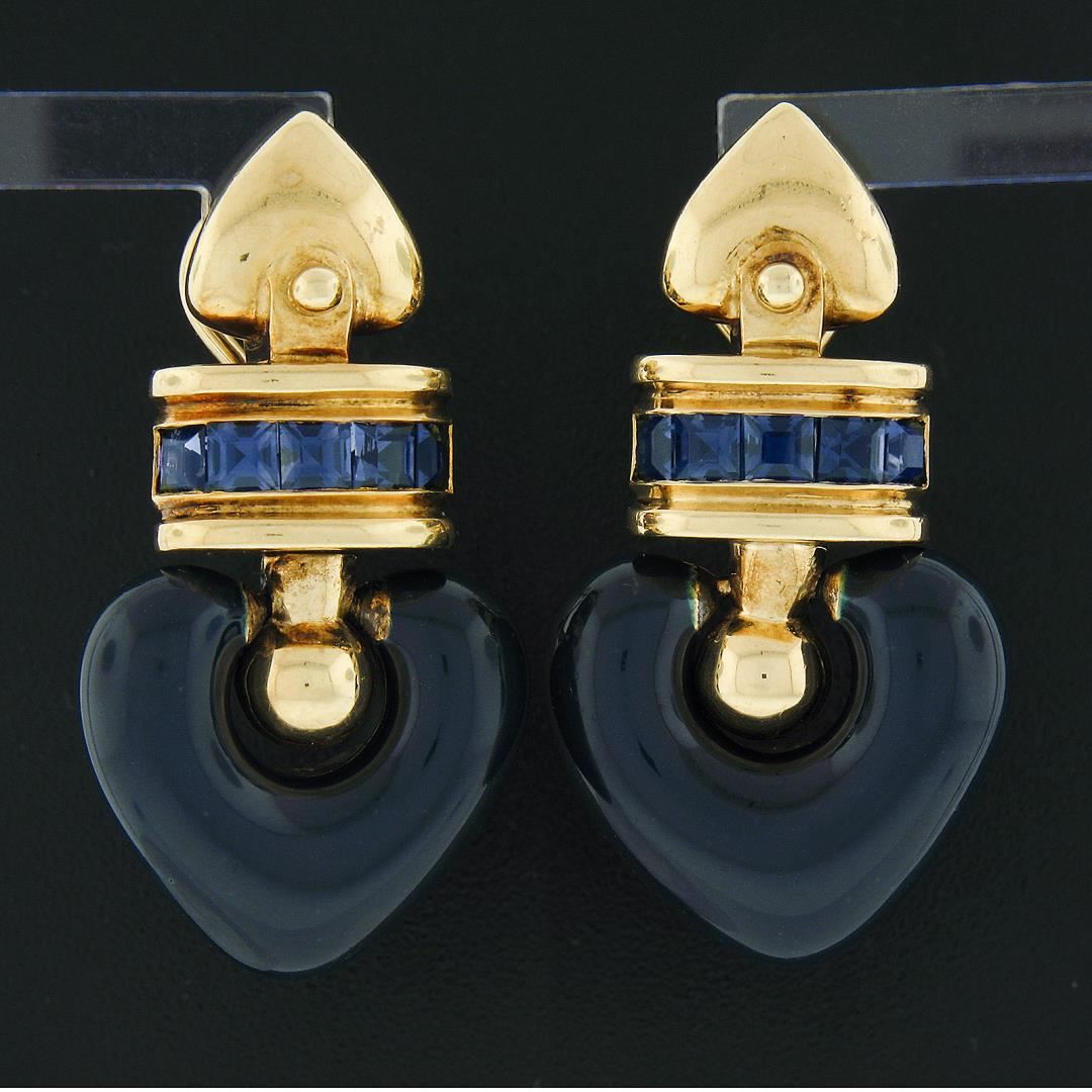 A solid 18k yellow gold dangle earrings by La Nouvelle Bague, with blue enamel work & 10 square step cut natural tanzanites (1.00ctw). The earrings measure approximately 37.1x19.9mm and weigh a total of 25.44 grams.
