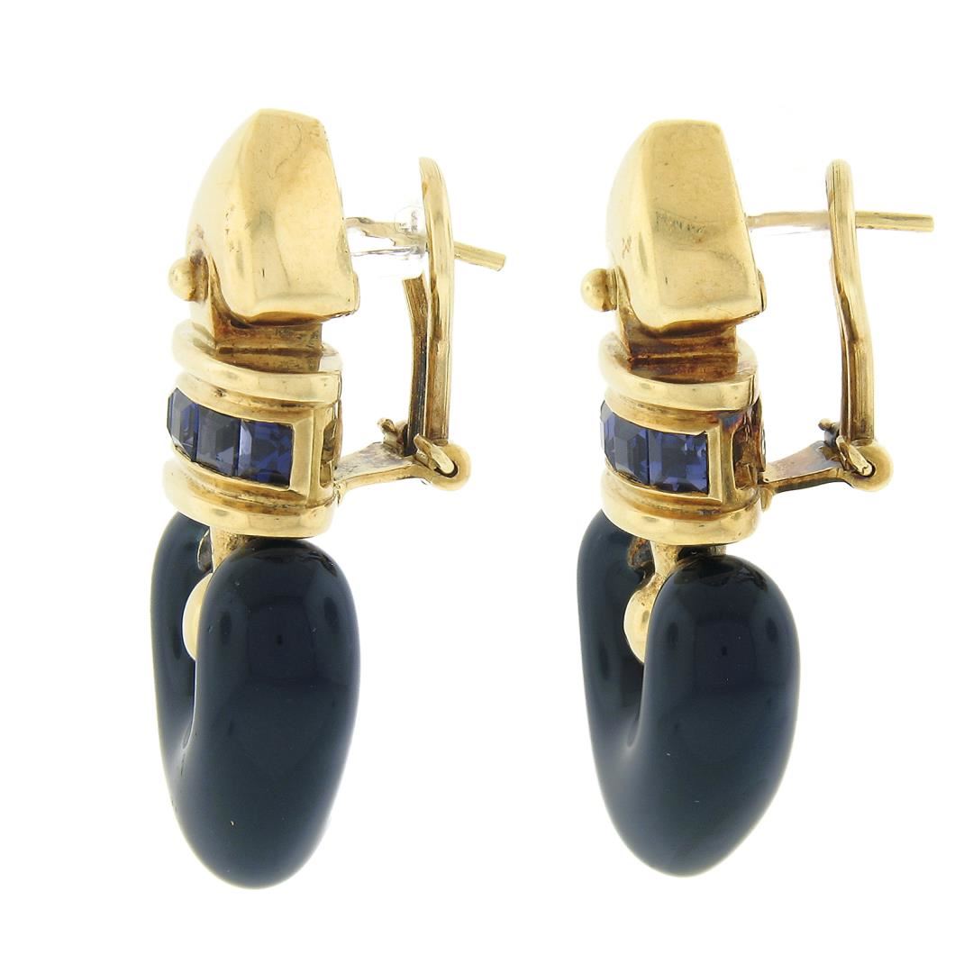 A solid 18k yellow gold dangle earrings by La Nouvelle Bague, with blue enamel work & 10 square step cut natural tanzanites (1.00ctw). The earrings measure approximately 37.1x19.9mm and weigh a total of 25.44 grams.