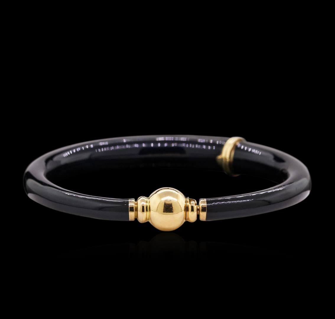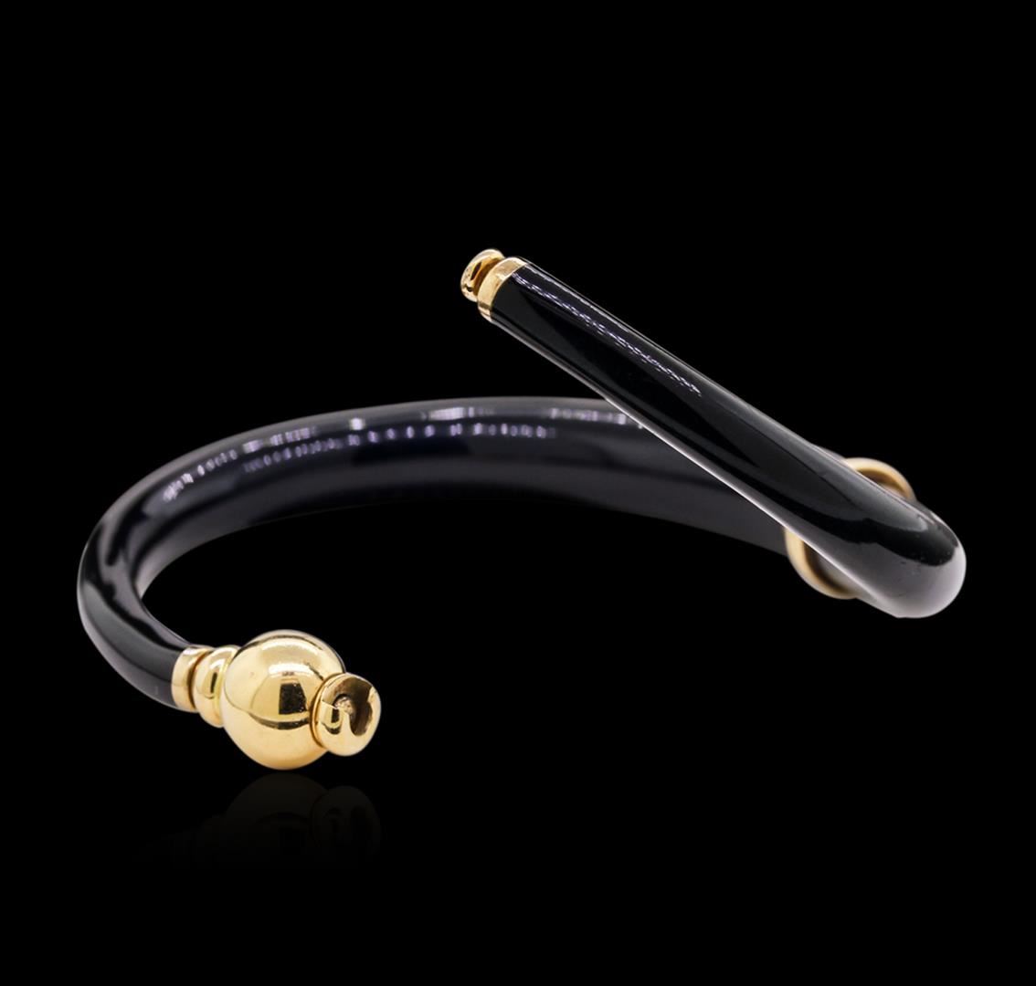 18k Yellow Gold / Silver; Black Enamel; 25.2 g total weight; Size 6.5; Beautiful bangle bracelet by La Nouvelle Bague!