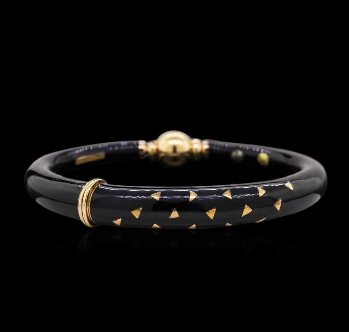 18k Yellow Gold / Silver; Black Enamel; 25.2 g total weight; Size 6.5; Beautiful bangle bracelet by La Nouvelle Bague!