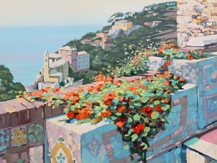 The terrace overlooking a gorgeous view is the subject of this Howard Behrens, sign & numbered limited edition serigraph on paper. 31.5 x 41