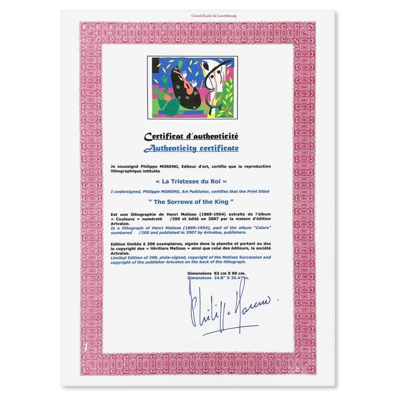 "La Tristesse du roi" is a limited edition lithograph by Henri Matisse (1869-1954). This piece comes from an edition of 200 authorized by the Matisse Estate; the edition number is not on the piece itself but on the certificate. This piece comes custom framed. Includes Certificate of Authenticity. Measures approx. 41.5" x 31" (frame), 35.5" x 25" (image).
