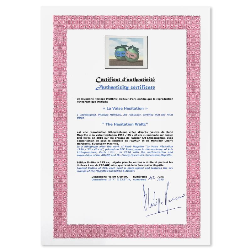 La Valse Hesitation (The Hesitation Waltz) is a limited edition lithograph by Rene Magritte (1898-1967). This piece is numbered 122/275 and bears the dry stamps of the Magritte Foundation & ADAGP (Society of Authors in the Graphic and Plastic Arts) and is signed by the President of the Magritte Foundation, Charly Herscovici. This piece comes custom framed. Includes Certificate of Authenticity. Measures approx. 29.5 x 24 (frame), 23.5 x 18 (image).
