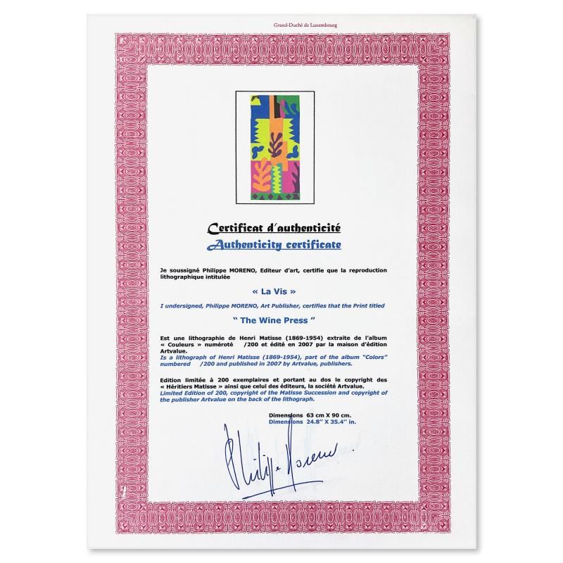 "La Vis" is a limited edition lithograph by Henri Matisse (1869-1954). This piece comes from an edition of 200 authorized by the Matisse Estate; the edition number is not on the piece itself but on the certificate. This piece comes custom framed. Includes Certificate of Authenticity. Measures approx. 31" x 41.5" (frame), 25" x 35.5" (image).
