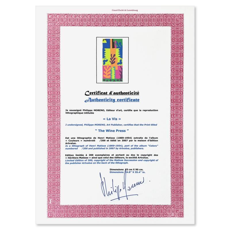 "La Vis" is a limited edition lithograph by Henri Matisse (1869-1954). This piece comes from an edition of 200 authorized by the Matisse Estate; the edition number is not on the piece itself but on the certificate. This piece comes custom framed. Includes Certificate of Authenticity. Measures approx. 31" x 41.5" (frame), 25" x 35.5" (image).