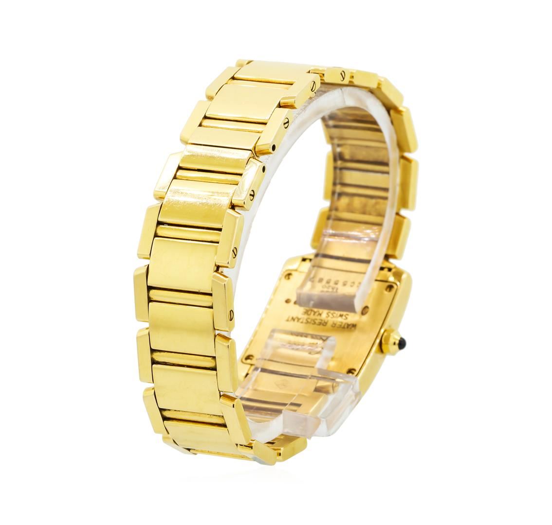 One ladies, Cartier Tank Francaise wristwatch electronically tested 18KT yellow gold, Case: 25 x 20mm, Swiss & Cartier Hallmarked Case Back: secured by four set screws, engraved with the manufacturer's name, and ID numbers, Cartier Signature Crown: octagonal, set with a Blue cabochon crystal, Bezel: polished, Crystal: synthetic sapphire. Movement: quartz, Dial: Ivory color, guilloche, Blue-steel hands and Cartier Roman numerals, Cartier Bracelet: 18KT yellow gold panel bracelet, Condition: G-6 Extra Fine. Six and one quarter inch length. Swiss & Cartier Hallmarked concealed deployment clasp. Four removable links. Total Weight of Watch 71.61gm. AIG Appraised at $17,600.00.