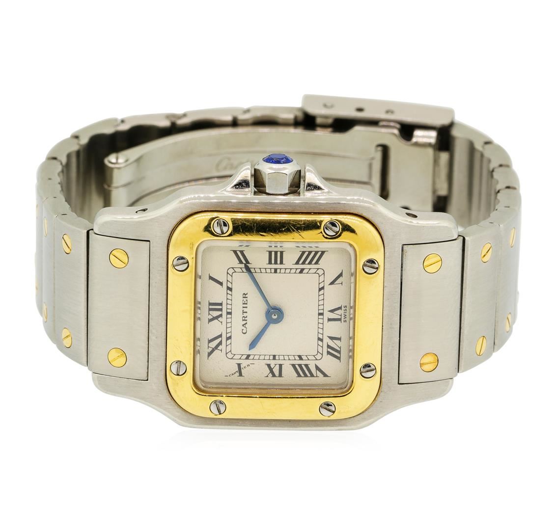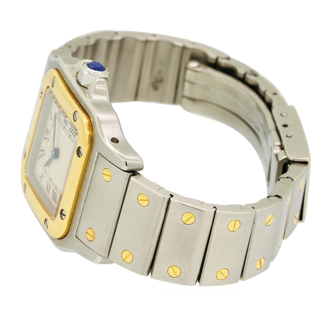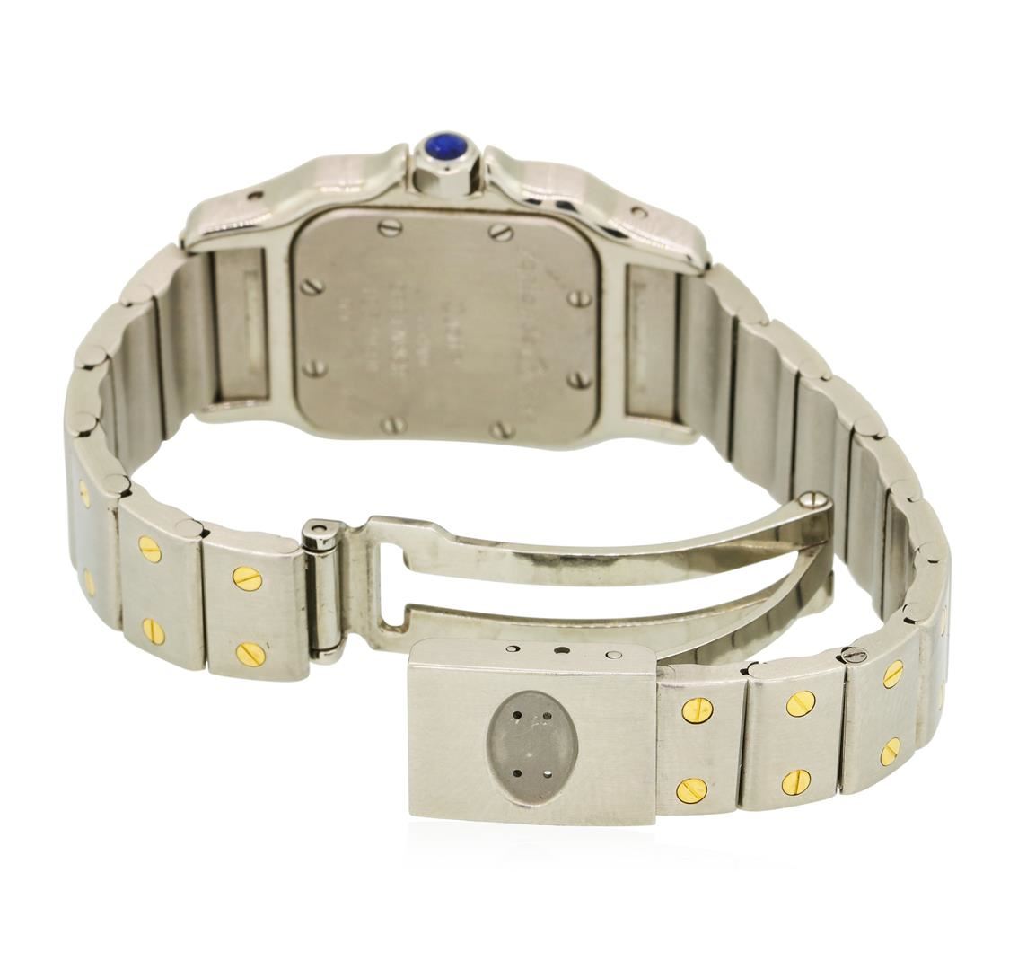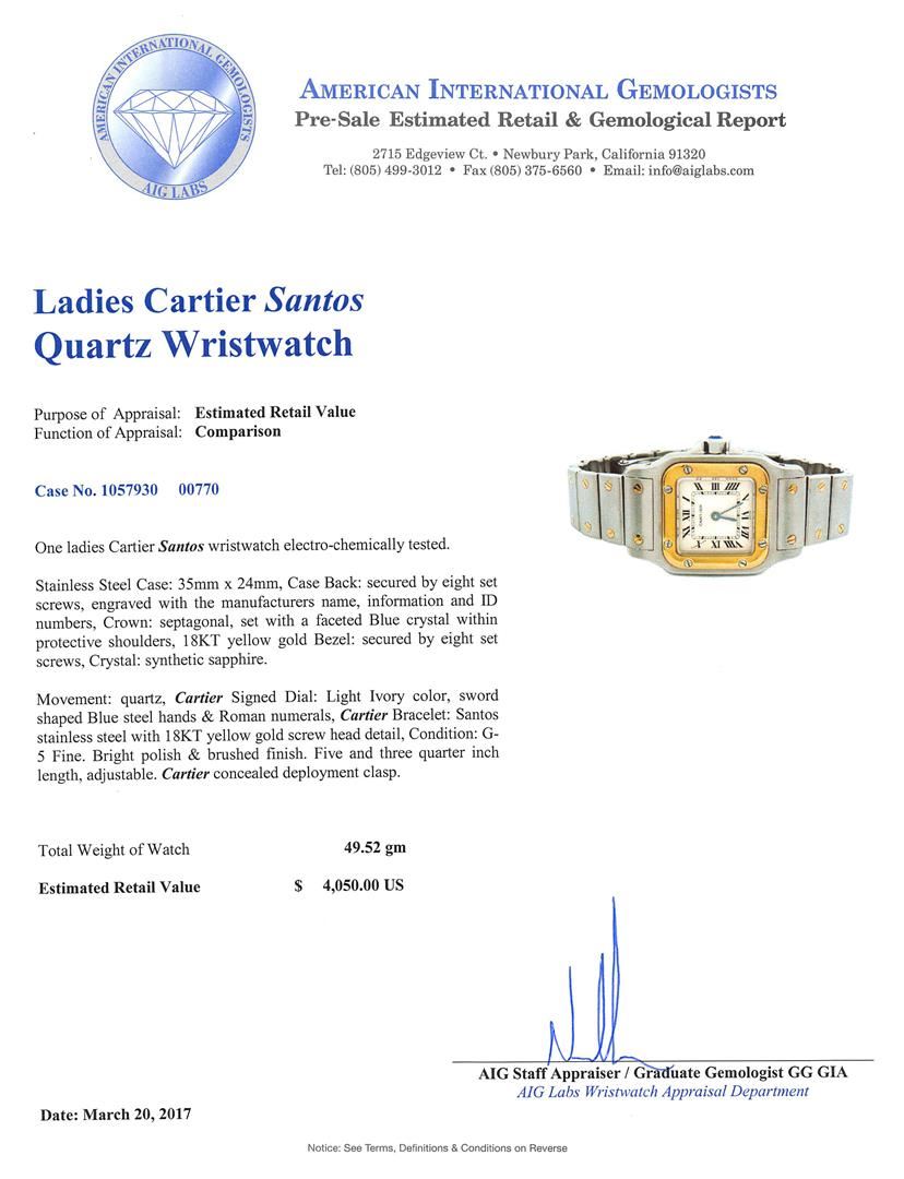 One ladies Cartier Santos wristwatch electro-chemically tested. Stainless Steel Case: 35mm x 24mm, Case Back: secured by eight set screws, engraved with the manufacturers name, information and ID numbers, Crown: septagonal, set with a faceted Blue crystal within protective shoulders, 18KT yellow gold Bezel: secured by eight set screws, Crystal: synthetic sapphire.Movement: quartz, Cartier Signed Dial: Light Ivory color, sword shaped Blue steel hands & Roman numerals, Cartier Bracelet: Santos stainless steel with 18KT yellow gold screw head detail, Condition: G-5 Fine. Bright polish & brushed finish. Five and three quarter inch length, adjustable. Cartier concealed deployment clasp.Total Weight of Watch 49.52gm. AIG Appraised at $4,050.00.