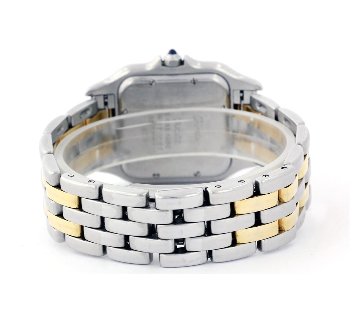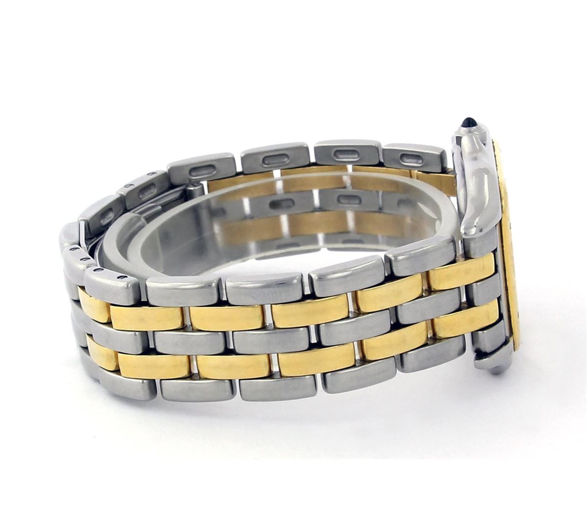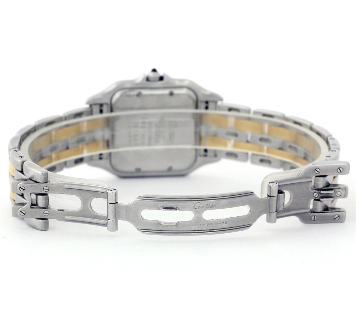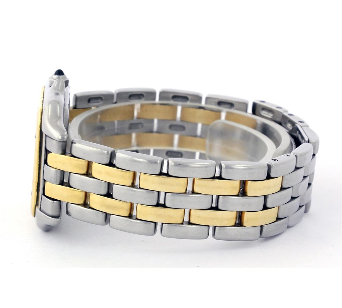 One Ladies Yellow Gold & Stainless Steel Panthere, Serviced & Electronically Tested, Case:27mm, Stainless Steel Crown, Bezel: 18K Yellow Gold Bezel, Crystal: Sapphire Lens. Movement: Quartz Movement. Dial: White Dial With Roman Hour Markers Date Window at 5'O Clock Position. Model#183949 Condition: G-6 Extra Fine. Bracelet: 18K Yellow Gold & Stainless Steel 6.0 Inch Length, Adjustable. Standard Clasp.