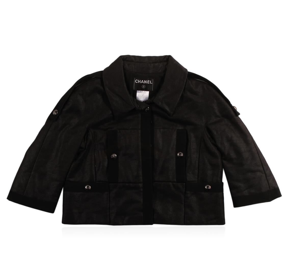 One Ladies Chanel Jacket. The outside of the jacket is composed of 90% cotton and 10% cashmere. The inside is composed of 100% silk. The jacket is in good condition. Made in France. Size as marked 40 (France).