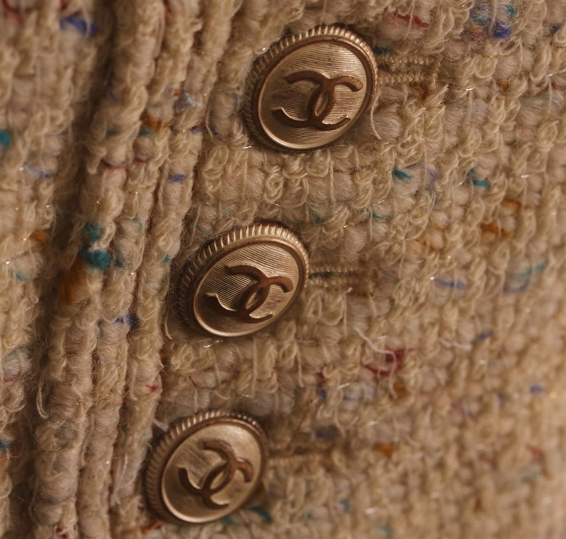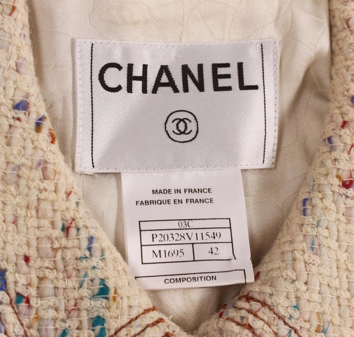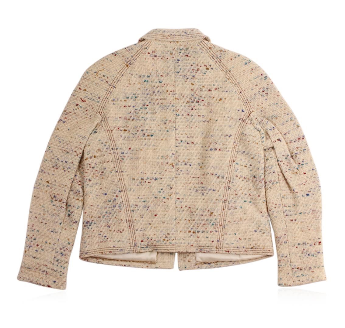 One Ladies Chanel Wool Jacket. The outside of the jacket is composed of 92% wool, 4% nylon, and 4% rayon. The inside is composed of 95% silk and 5% spandex. The jacket is in good condition. Made in France. Size as marked 42 (France).