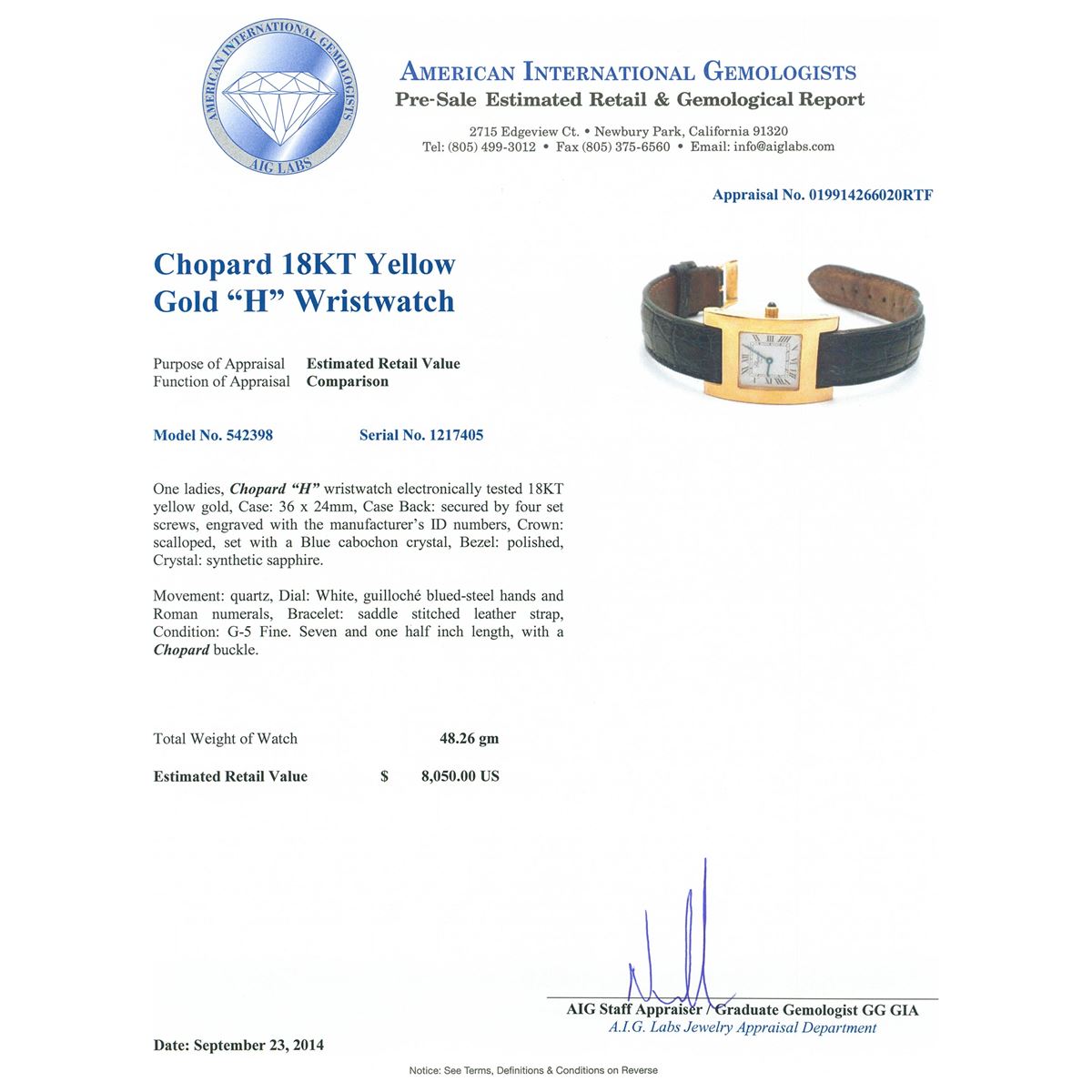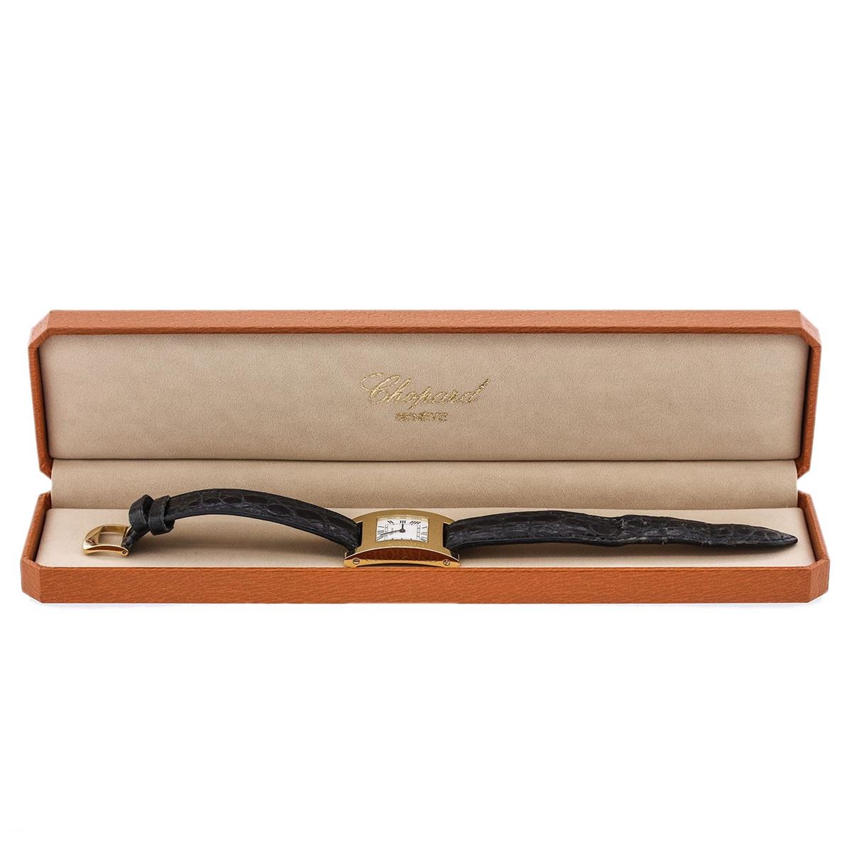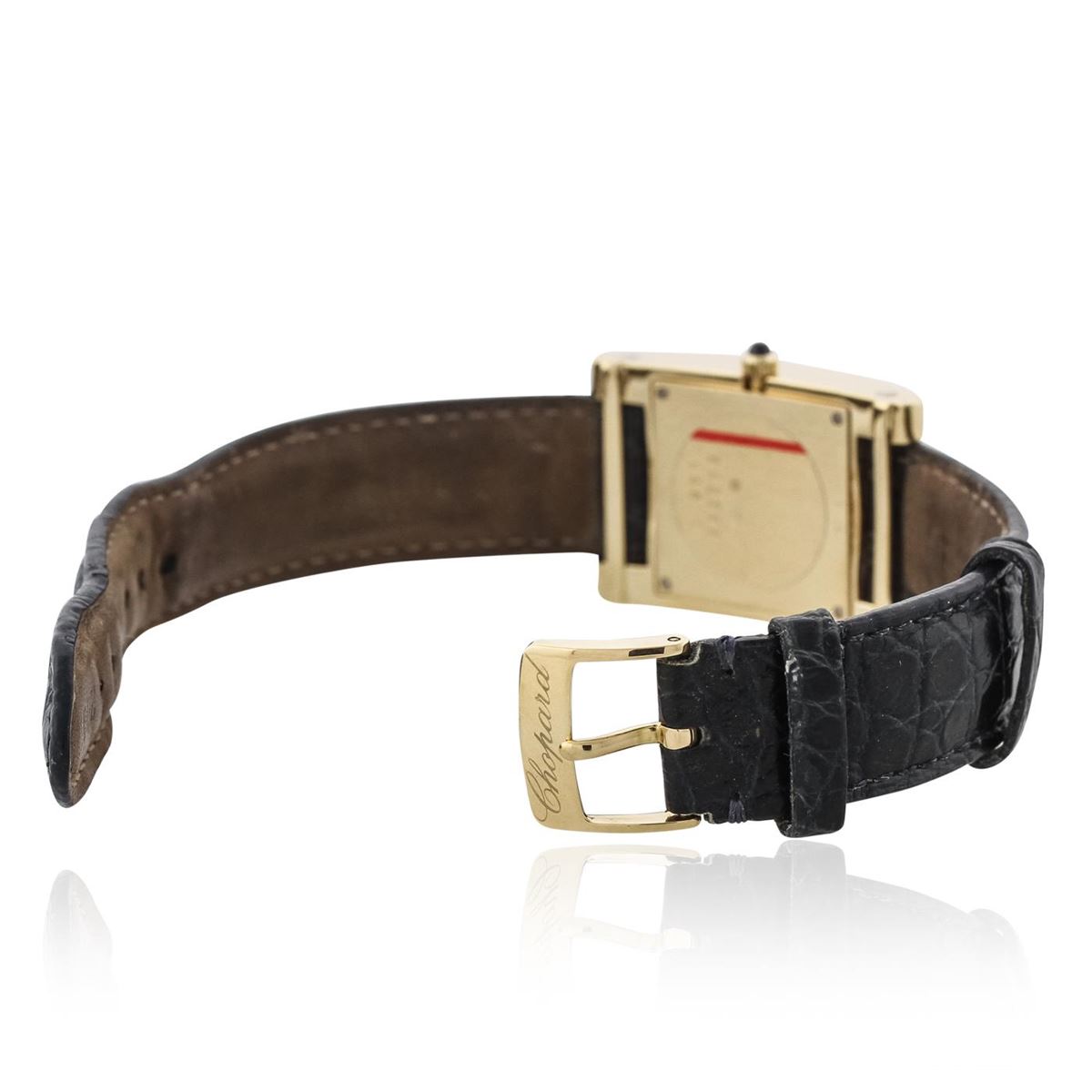 One ladies, Chopard "H" wristwatch electronically tested 18KT yellow gold, Case: 36 x 24mm, Case Back: secured by four set screws, engraved with the manufacturer's ID numbers, Crown: scalloped, set with a Blue cabochon crystal, Bezel: polished, Crystal: synthetic sapphire. Movement: quartz, Dial: White, guilloch, blued-steel hands and Roman numerals, Bracelet: saddle stitched leather strap, Condition: G-5 Fine. Seven and one half inch length, with a Chopard buckle. Total Weight of Watch 48.26 grams. AIG Appraised at $8,050.00.