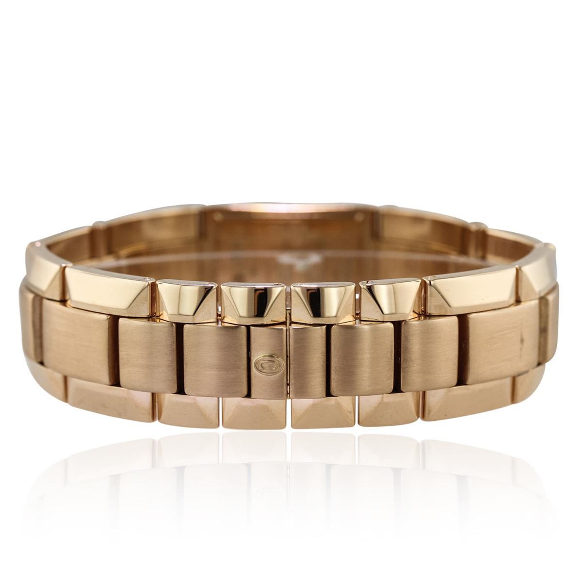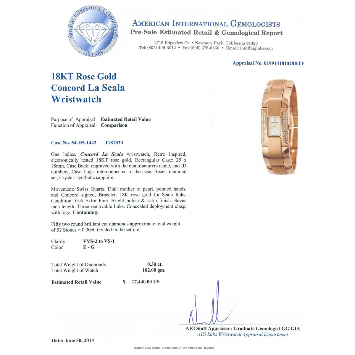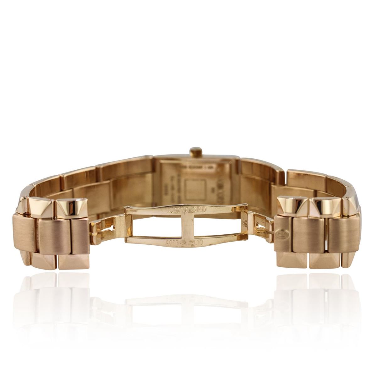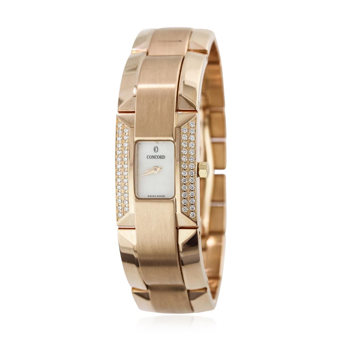 One ladies, Concord La Scala wristwatch, Retro inspired, electronically tested 18KT rose gold, Rectangular Case: 25 x 18mm, Case Back: engraved with the manufacturers name, and ID numbers, Case Lugs: interconnected to the case, Bezel: diamond set, Crystal: synthetic sapphire. Movement: Swiss Quartz. Dial: mother of pearl, pointed hands, and Concord signed, Bracelet: 18K rose gold La Scala links, Condition: G-6 Extra Fine. Bright polish & satin finish. Seven inch length. Three removable links. Concealed deployment clasp, with logo. Containing: Fifty two round brilliant cut diamonds approximate. Total Weight of 52 Stones = 0.30ct. Graded in the setting. Clarity: VVS-2 to VS-1 Color E - G Total Weight of Diamonds 0.30ct. Total Weight of Watch102.00 grams. AIG Appraised at $17,440.00.