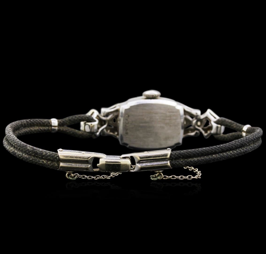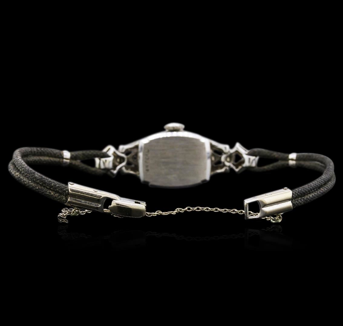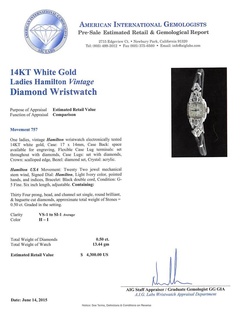 One ladies, vintage Hamilton wristwatch electronically tested 14KT white gold, Case: 17 x 14mm, Case Back: space available for engraving, Flexible Case Lug terminals: set throughout with diamonds, Case Lugs: set with diamonds, Crown: scalloped edge, Bezel: diamond set, Crystal: acrylic. Hamilton USA Movement: Twenty Two jewel mechanical stem wind, Signed Dial: Hamilton, Light Ivory color, pointed hands, and indices, Bracelet: Black double cord, Condition: G-5 Fine. Six inch length, adjustable. Containing: Thirty Four prong, bead, and channel set single, round brilliant, & baguette cut diamonds, approximate total weight of Stones = 0.50 ct. Graded in the setting. Clarity: VS-1 to SI-1 Average. Color: H - I. Total Weight of Diamonds: 0.50ct. Total Weight of Watch: 13.44 grams. AIG Appraised at $4,300.00.