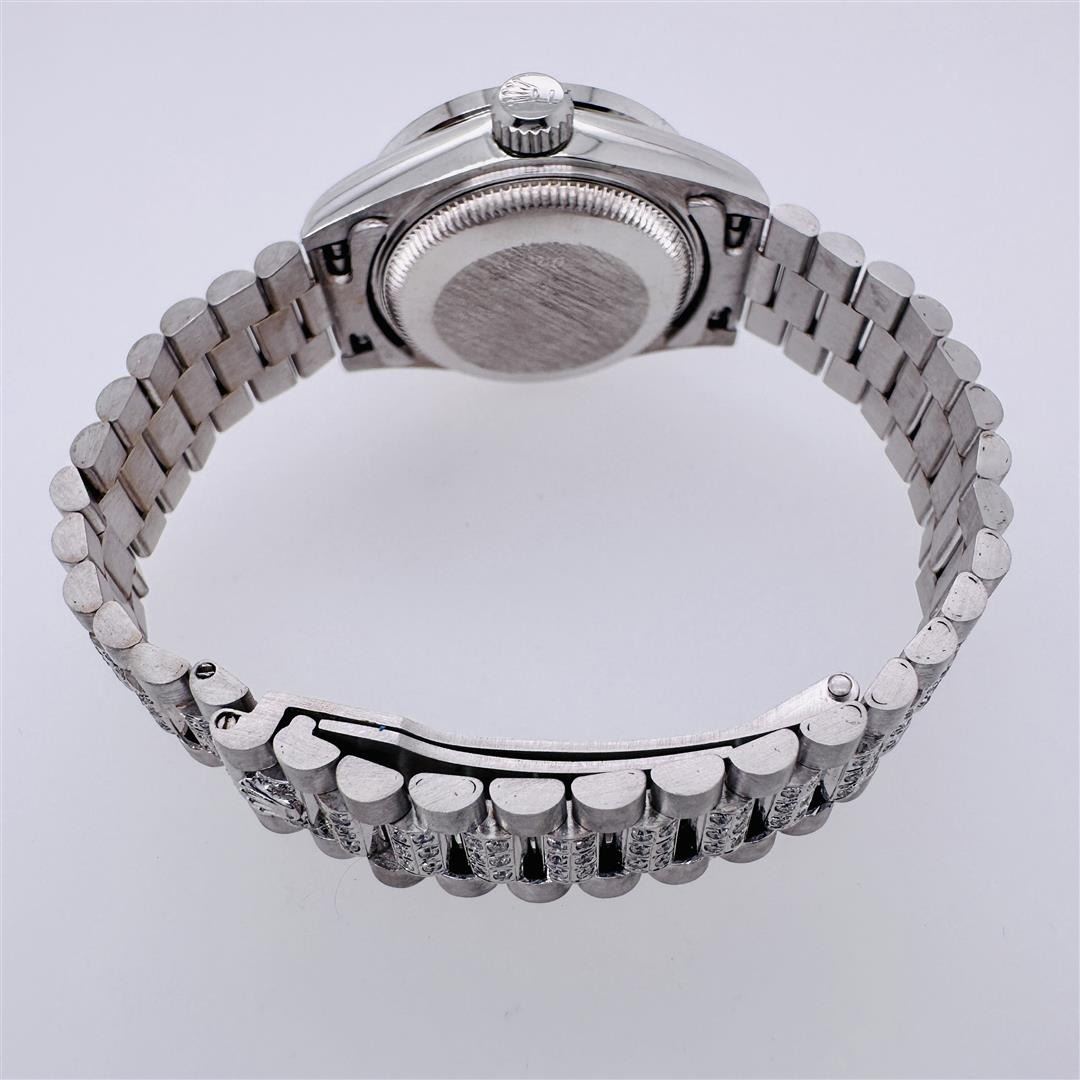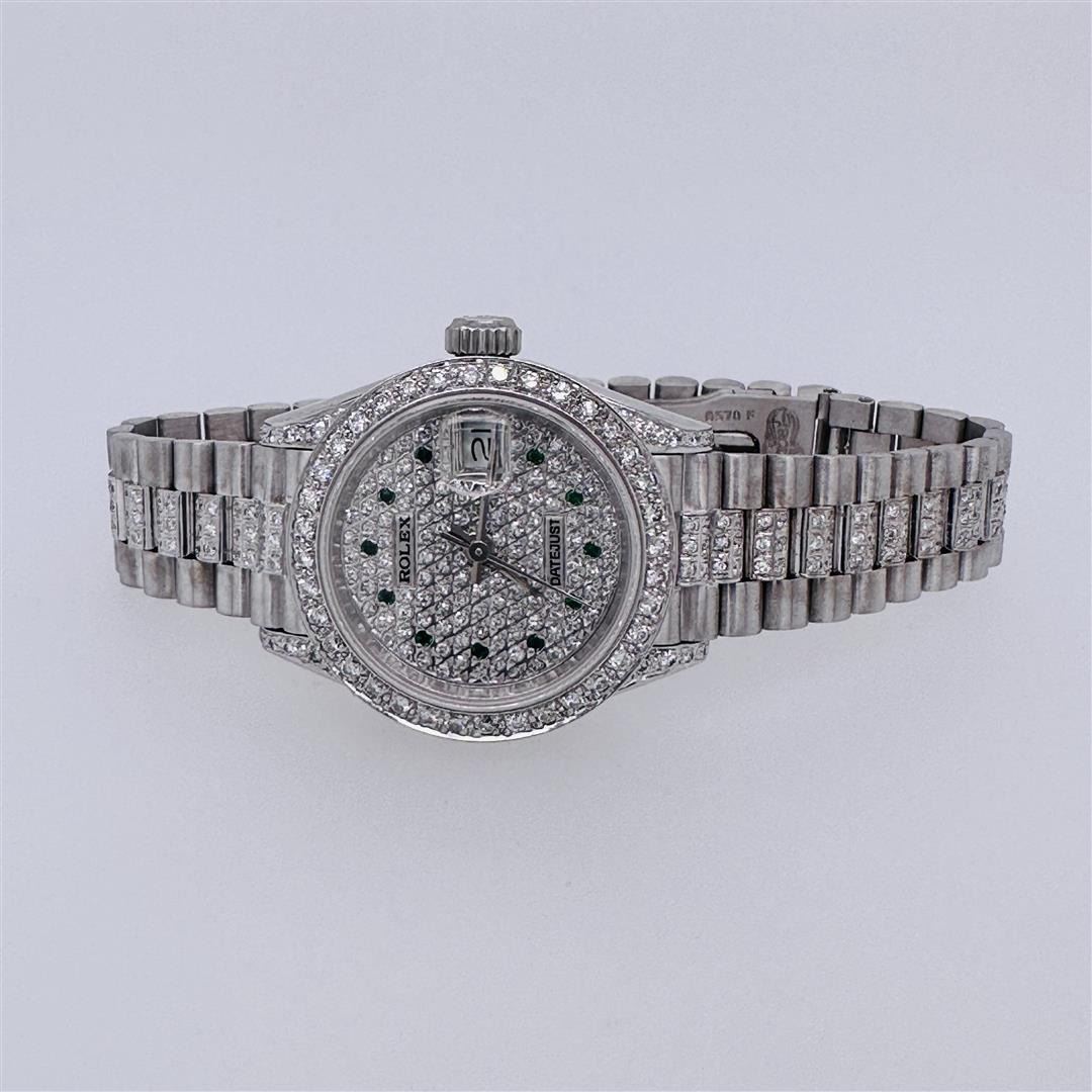 Ladies Rolex President white gold and diamonds. Incredible, beautiful and serviced looks and runs like new! Custom dial with diamonds and emeralds, Custom Bezel with diamonds, Custom diamonds on the bracelet, Custom diamonds on the lugs.