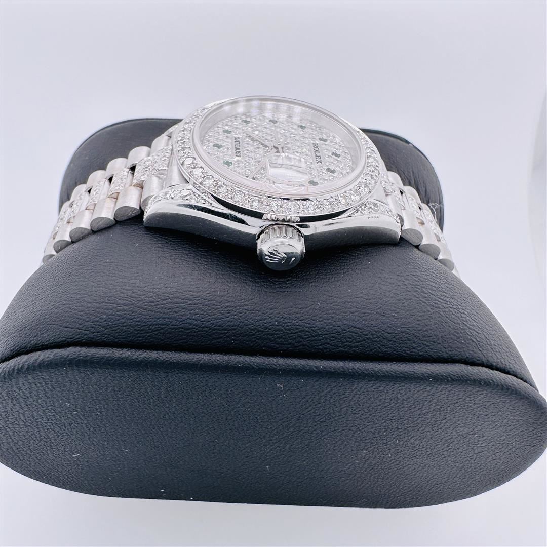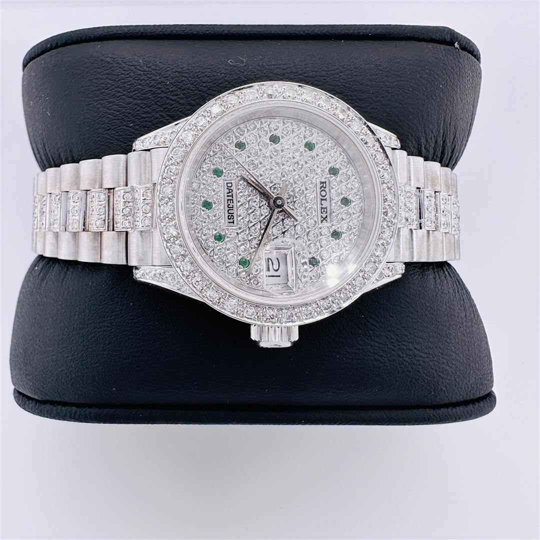 Ladies Rolex President white gold and diamonds. Incredible, beautiful and serviced looks and runs like new! Custom dial with diamonds and emeralds, Custom Bezel with diamonds, Custom diamonds on the bracelet, Custom diamonds on the lugs.