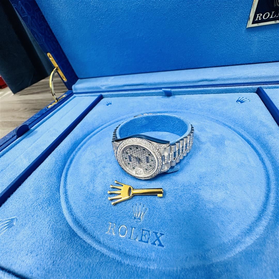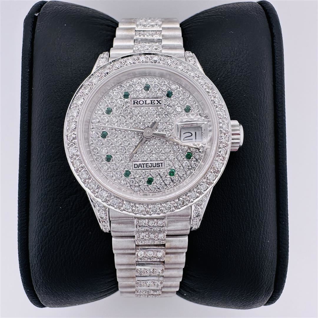 Ladies Rolex President white gold and diamonds. Incredible, beautiful and serviced looks and runs like new! Custom dial with diamonds and emeralds, Custom Bezel with diamonds, Custom diamonds on the bracelet, Custom diamonds on the lugs.
