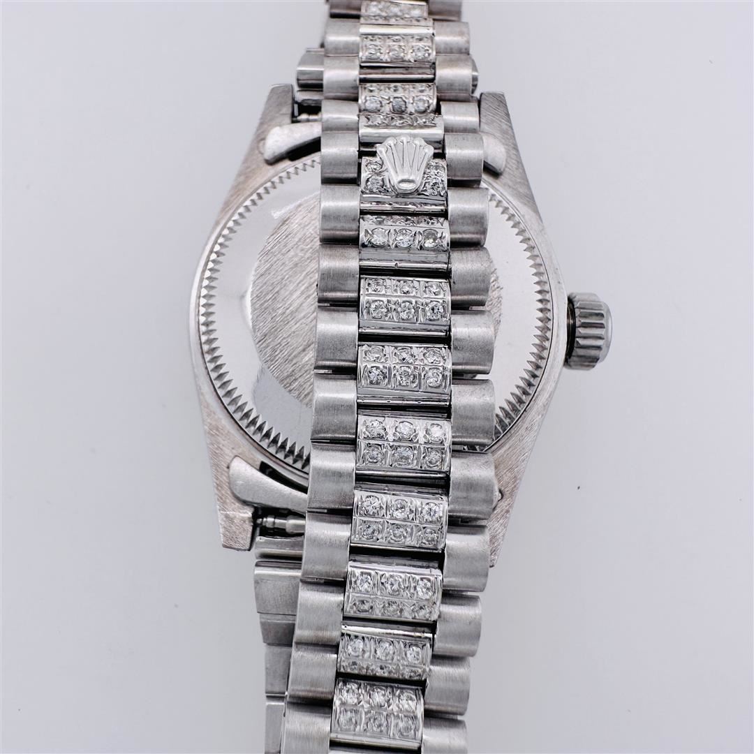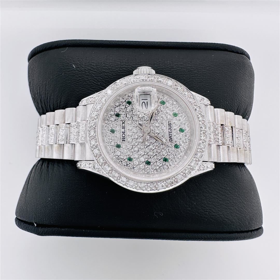 Ladies Rolex President white gold and diamonds. Incredible, beautiful and serviced looks and runs like new! Custom dial with diamonds and emeralds, Custom Bezel with diamonds, Custom diamonds on the bracelet, Custom diamonds on the lugs.