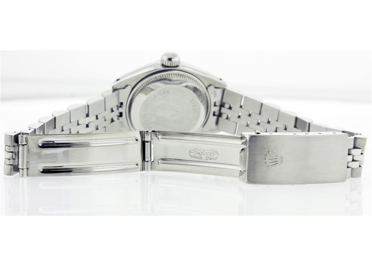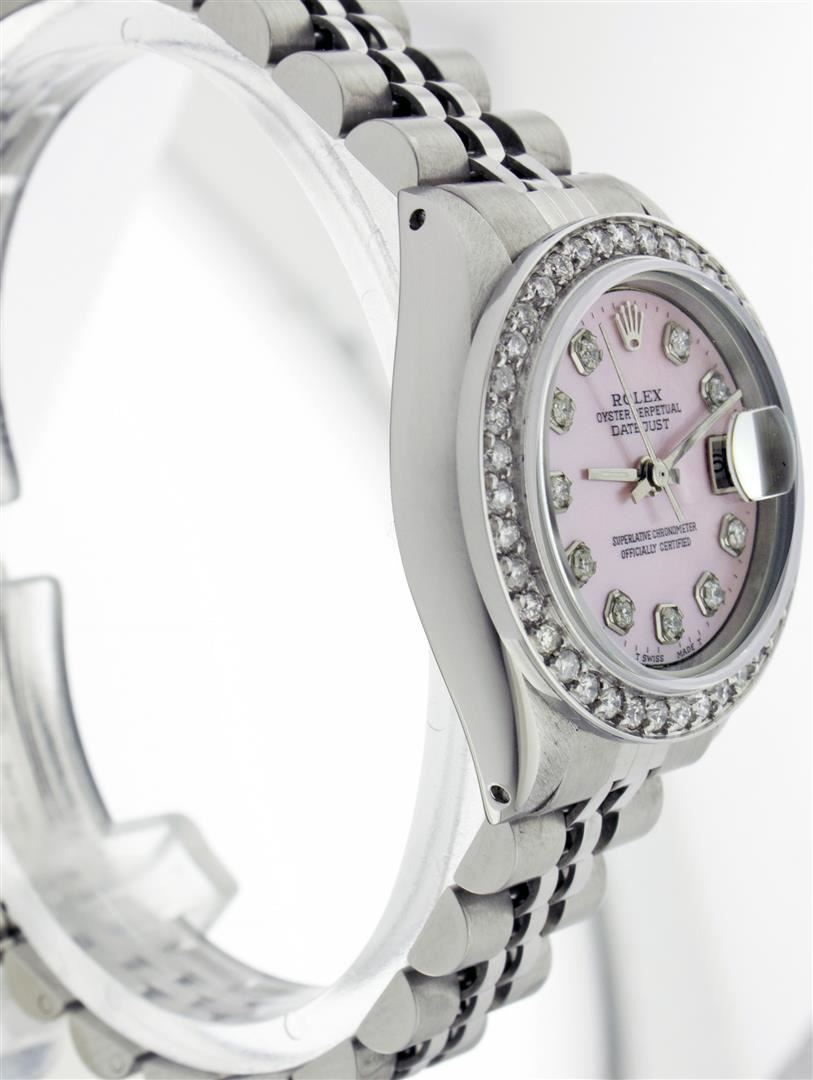 One Ladies Rolex Datejust Polished Bright with Satin Finish, Serviced & Electronically Tested, Stainless Steel Case:26mm, Stainless Steel Crown, Custom Bezel: Stainless Steel Beadset Diamond Bezel, Diamond Count: 40 Diamonds Total Weight 1.00 Carat, Clarity: SI-VS, Color: G to H. Custom Crystal: Synthetic Sapphire Cyclops Lens. Movement: Automatic Winding Movement Caliber 2030. Custom Dial: Pink Dial With Diamond Hour Markers, Diamond Count: 10 Diamonds In Dial, Clarity: SI-VS, Color: G to H. Date Window: 3 O'Clock Position Date Display, Quickset, Model: 6917 Condition: G-6 Extra Fine. Bracelet: Stainless Steel Jubilee. Bright Polish & Satin Finish. 5.5 Inch Length, Adjustable. Standard Clasp, With Rolex Logo.