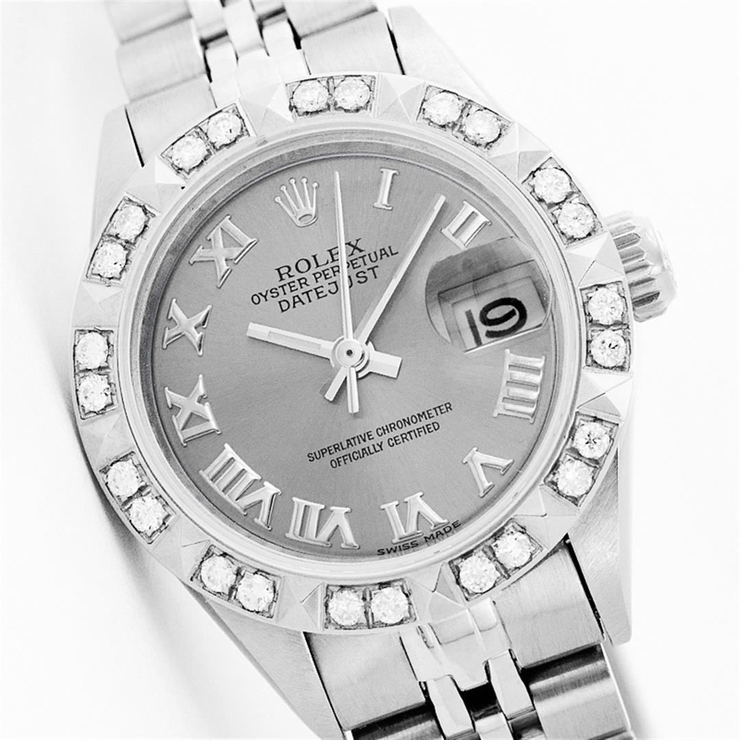 One Ladies Rolex Datejust Polished Bright with Satin Finish, Serviced & Electronically Tested, Stainless Steel Case:26mm, Stainless Steel Crown, Custom Bezel: 18K White Gold Pyramid Diamond Bezel, Diamond Count: 24 Diamonds Total Weight .50 Carat, Clarity: SI-VS, Color: G to H. Custom Crystal: Synthetic Sapphire Cyclops Lens. Movement: Automatic Winding Movement Caliber 2030. Custom Dial: Slate Grey Roman Dial. Clarity: SI-VS, Color: G to H. Date Window: 3 O'Clock Position Date Display, Model: 6917 Condition: G-6 Extra Fine. Bracelet: Stainless Steel Jubilee Band. Bright Polish & Satin Finish. 5.5 Inch Length, Adjustable. Standard Clasp, With Rolex Logo.